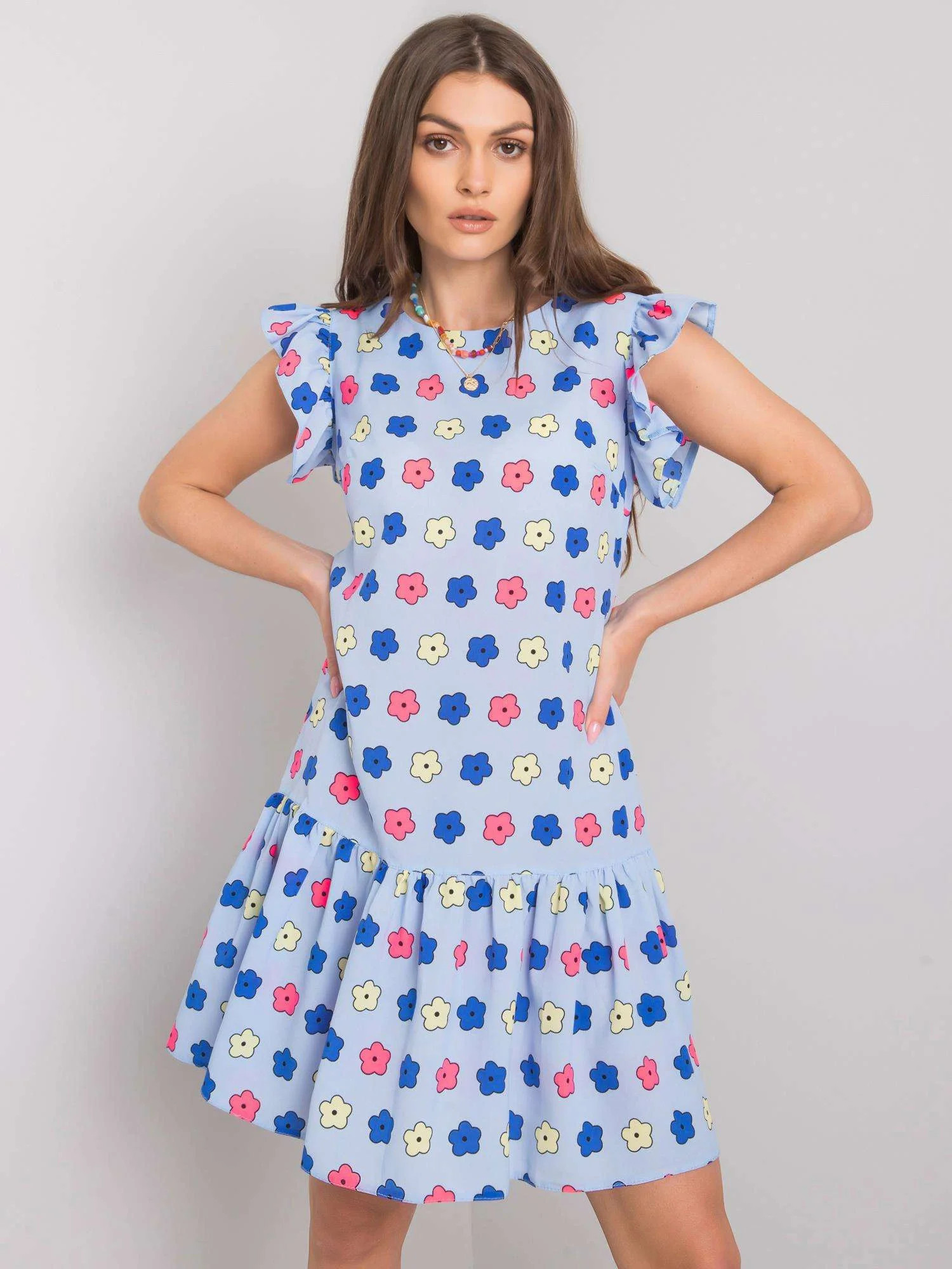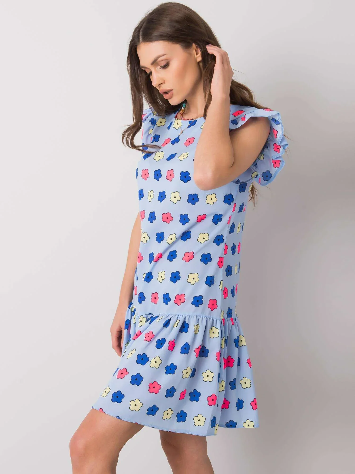 Modré dámské květované šaty s volánem.