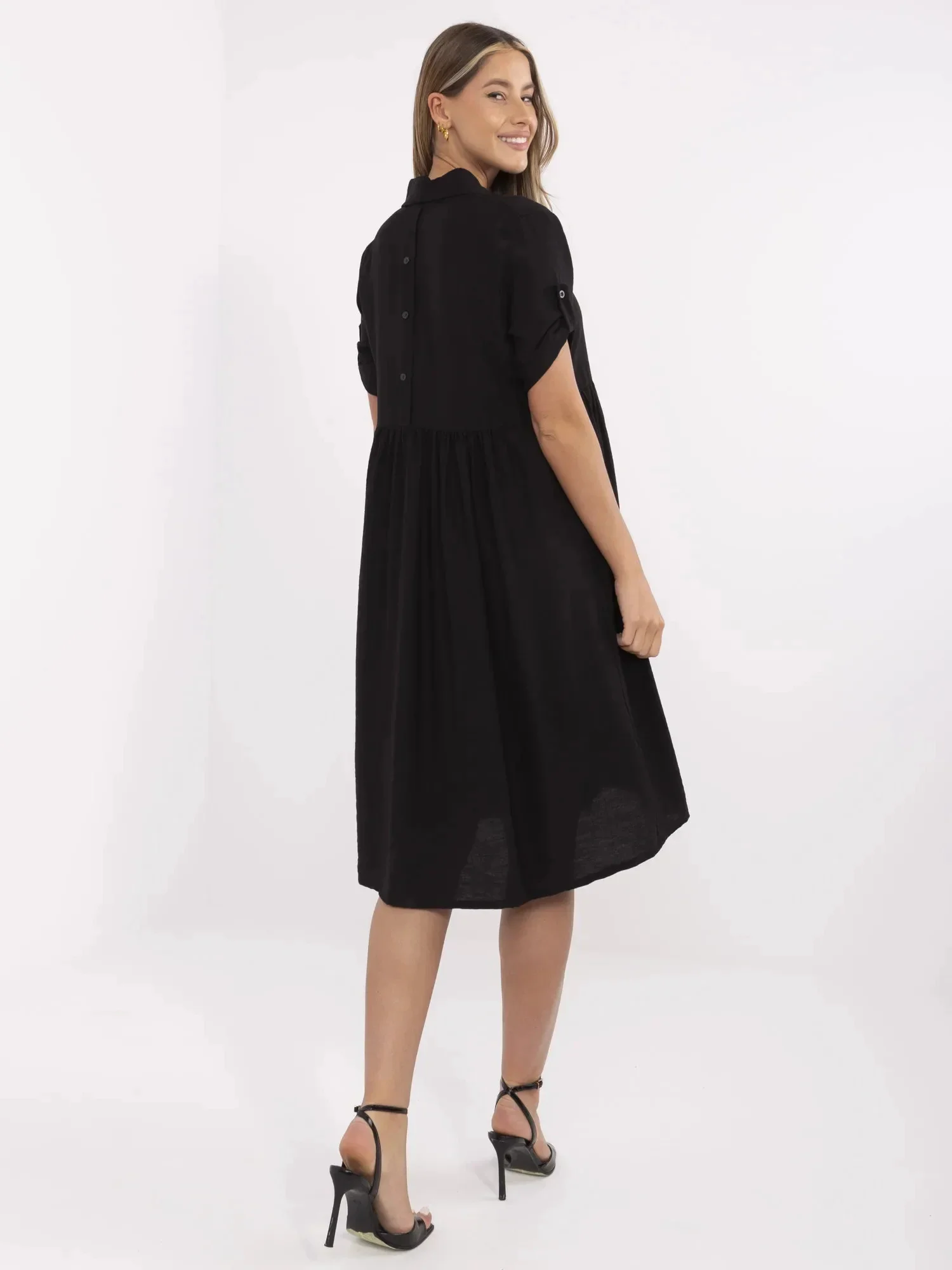 Wymiary sukienki w rozmiarze one size mierzone na płasko: szerokość pod pachami - 49 cm, szerokość w talii - 49 cm, długość rękawa - 26 cm, szerokość w biodrach - 77 cm, długość całkowita - 105 cm.