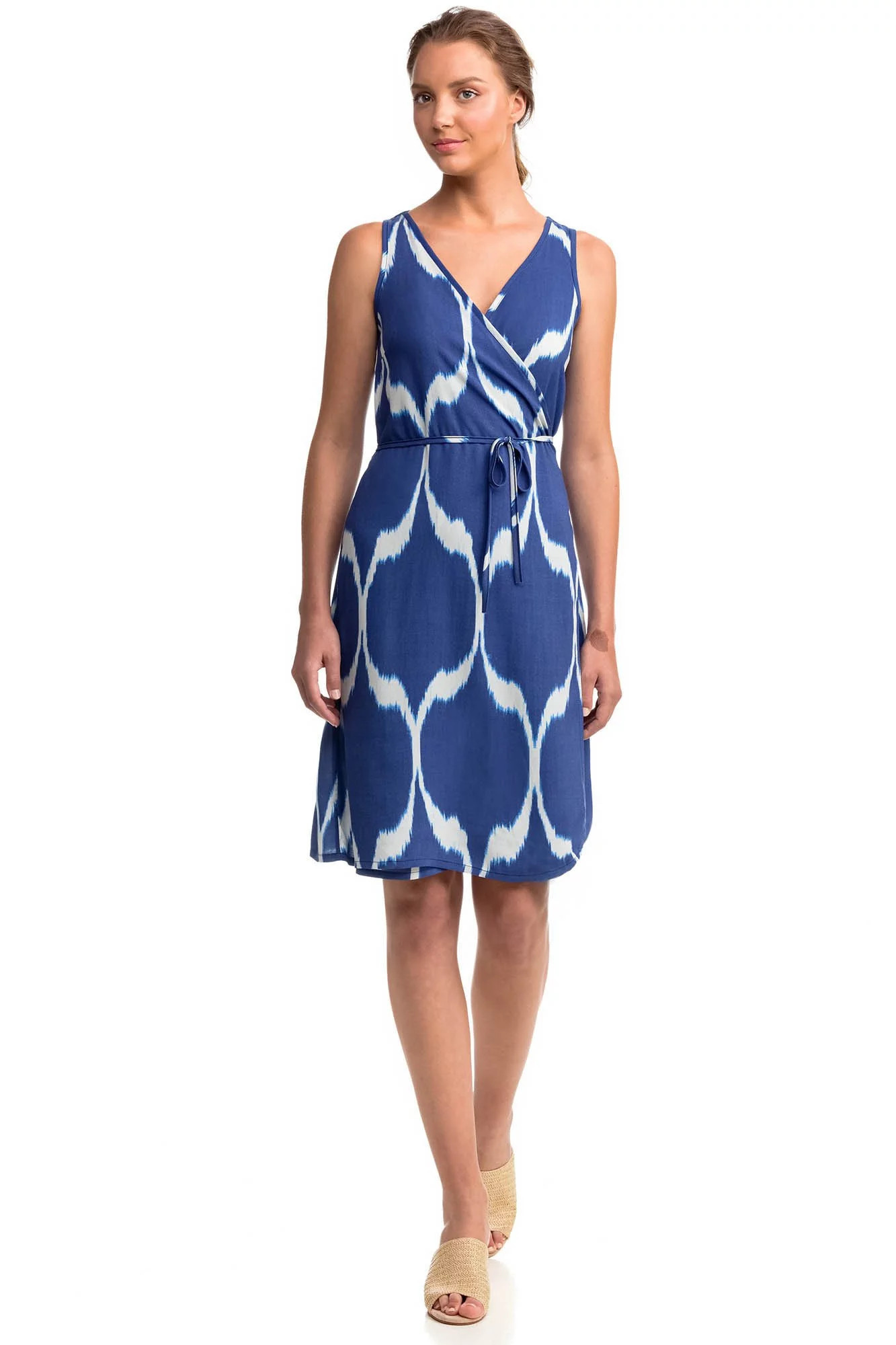 Letní dámké šaty s moderním potiskem na ramínka a výsřihem do V.Šaty jsou vyrobené z kvalitního viskózového popelínu. Popelín je odolnou, pevnou, ale zároveň měkkou a na dotek příjemnou tkaninou, která je díky viskóze příjemně chladivá a ideální pro teplé letní období.