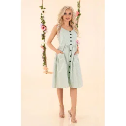 Prázdninové šaty s žebrováním na zádech. Volné, zapínané na ozdobné knoflíky v kontrastní barvě, s tenkými ramínky s nastavitelnou délkou. Dvě kapsy na přední straně. Vzdušný střih, volný v oblasti boků. Složení: 65 % polyester, 35 % bavlna.