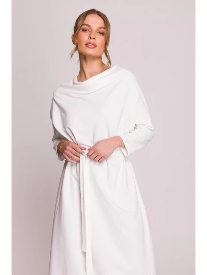 65% modal 30% bavlna 5% elastan DETAILY PRODUKTU: pletenina směs modalu volný střih dezén s páskem na zavazování přetažený přes hlavu délka pod kolena výstřih kapuce tříčtvrteční rukávy naše modelka měří 175 cm a nosí velikost S navrženo a vyrobeno v Polsku