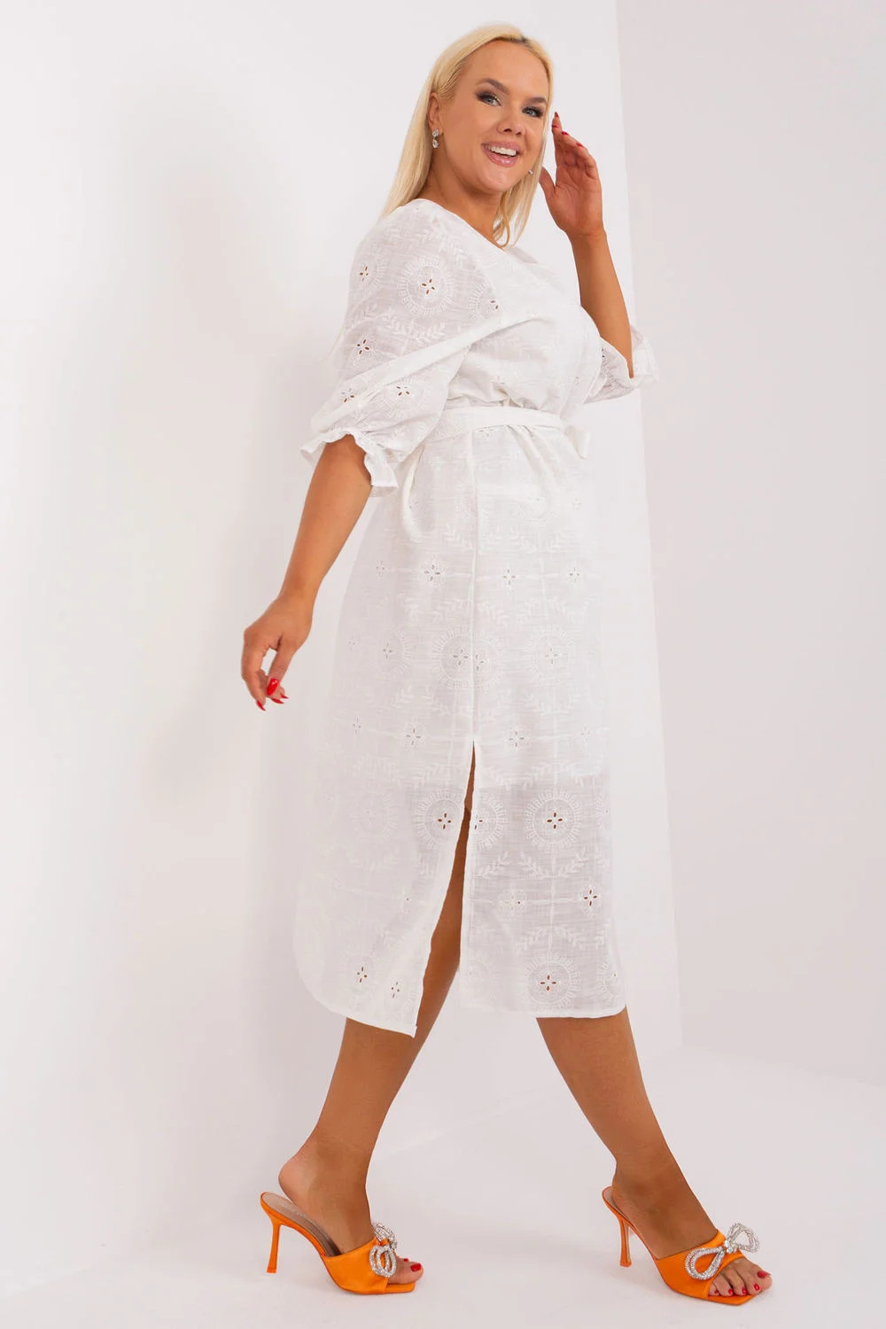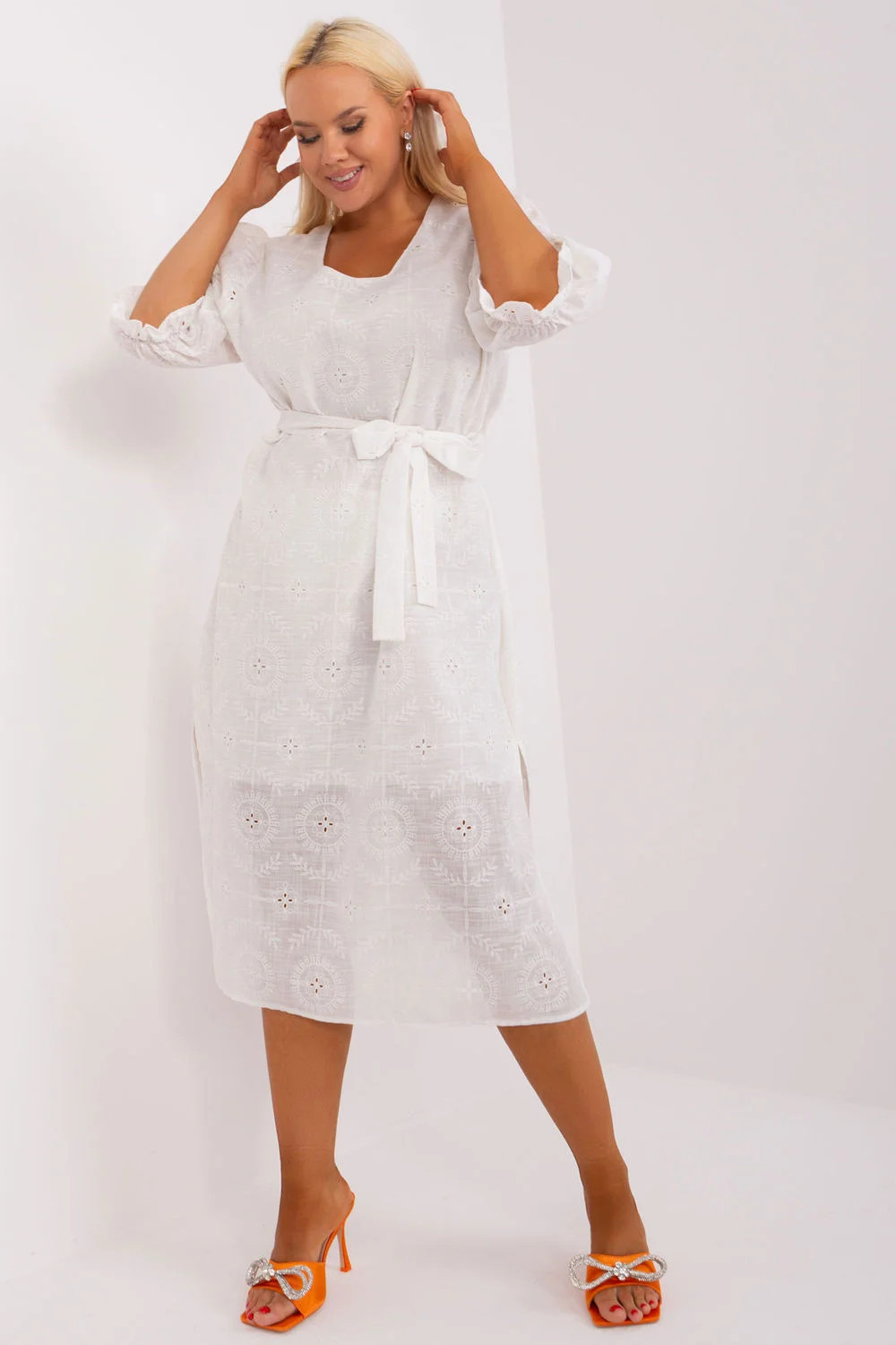 Bavlněné plus size šaty s 3/4 rukávy a kulatým výstřihem. Šaty mají podšívku, v pase se zavazují. Šaty jsou vyrobené z látky s výšivkou. Návrh pro mnoho příležitostí.