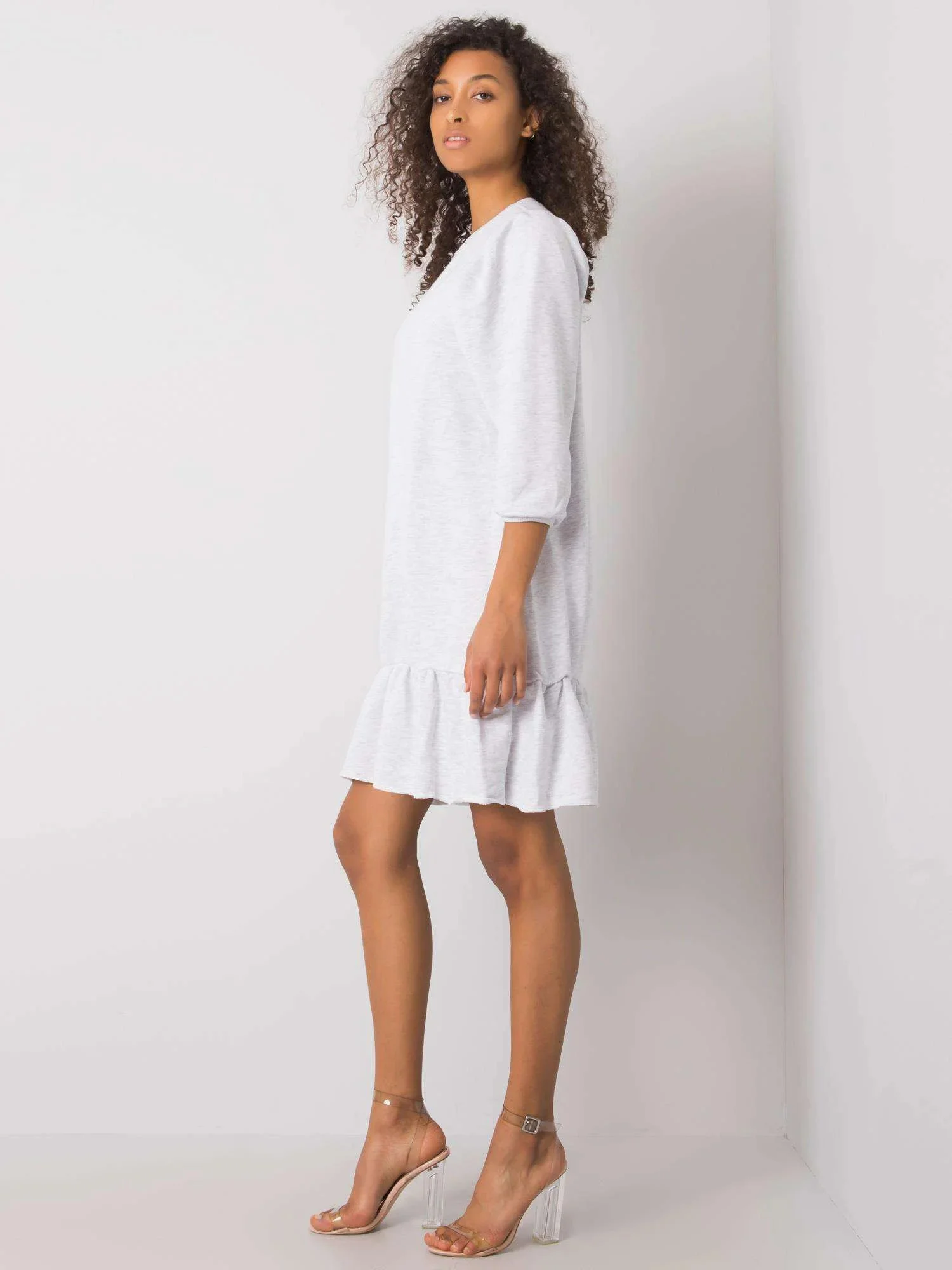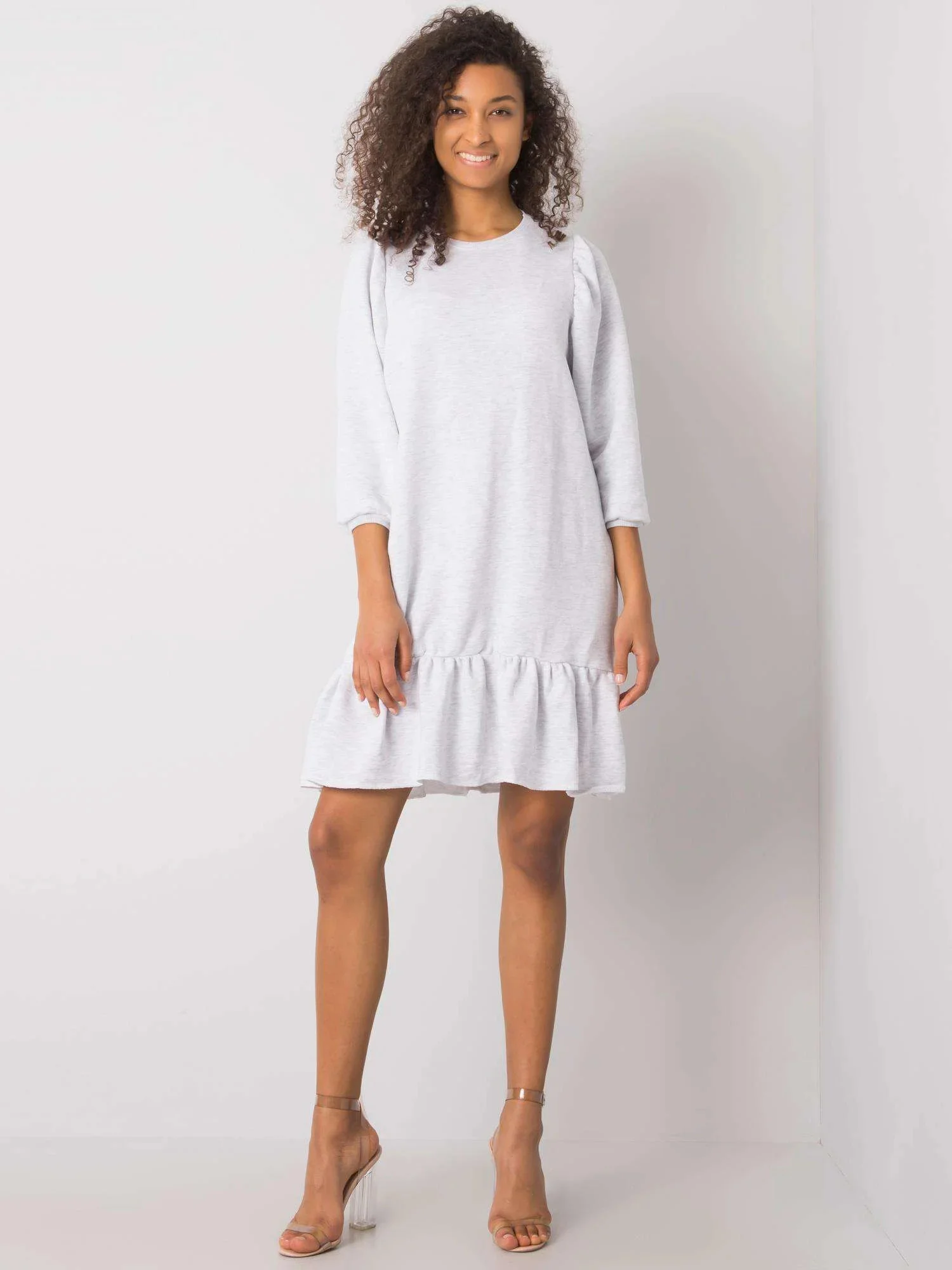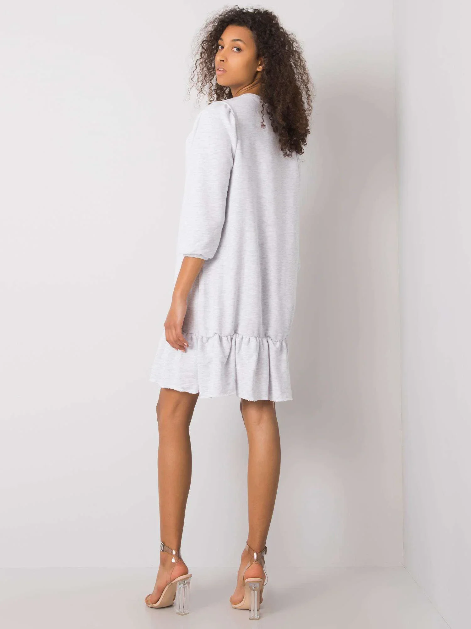 RUE PARIS Světle šedé melanžové šaty s volánem.