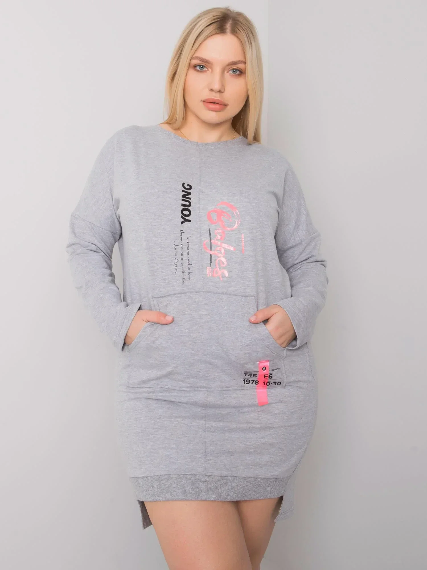 Šedé melanžové dámské plus size šaty s kapsami.
