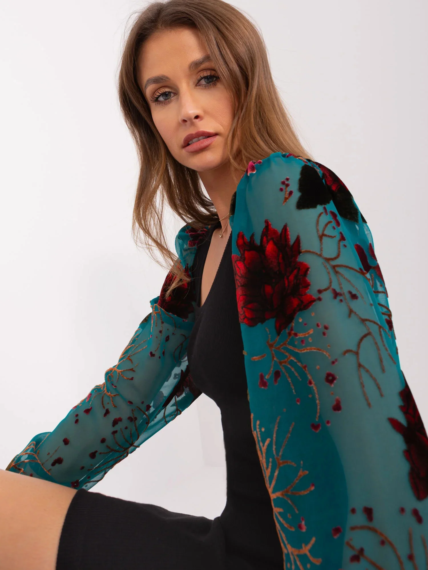 Modelka má na sobě velikost S/M. Rozměry modelky: výška 172 cm, prsa 89 cm, pas 65 cm, boky 93 cm.