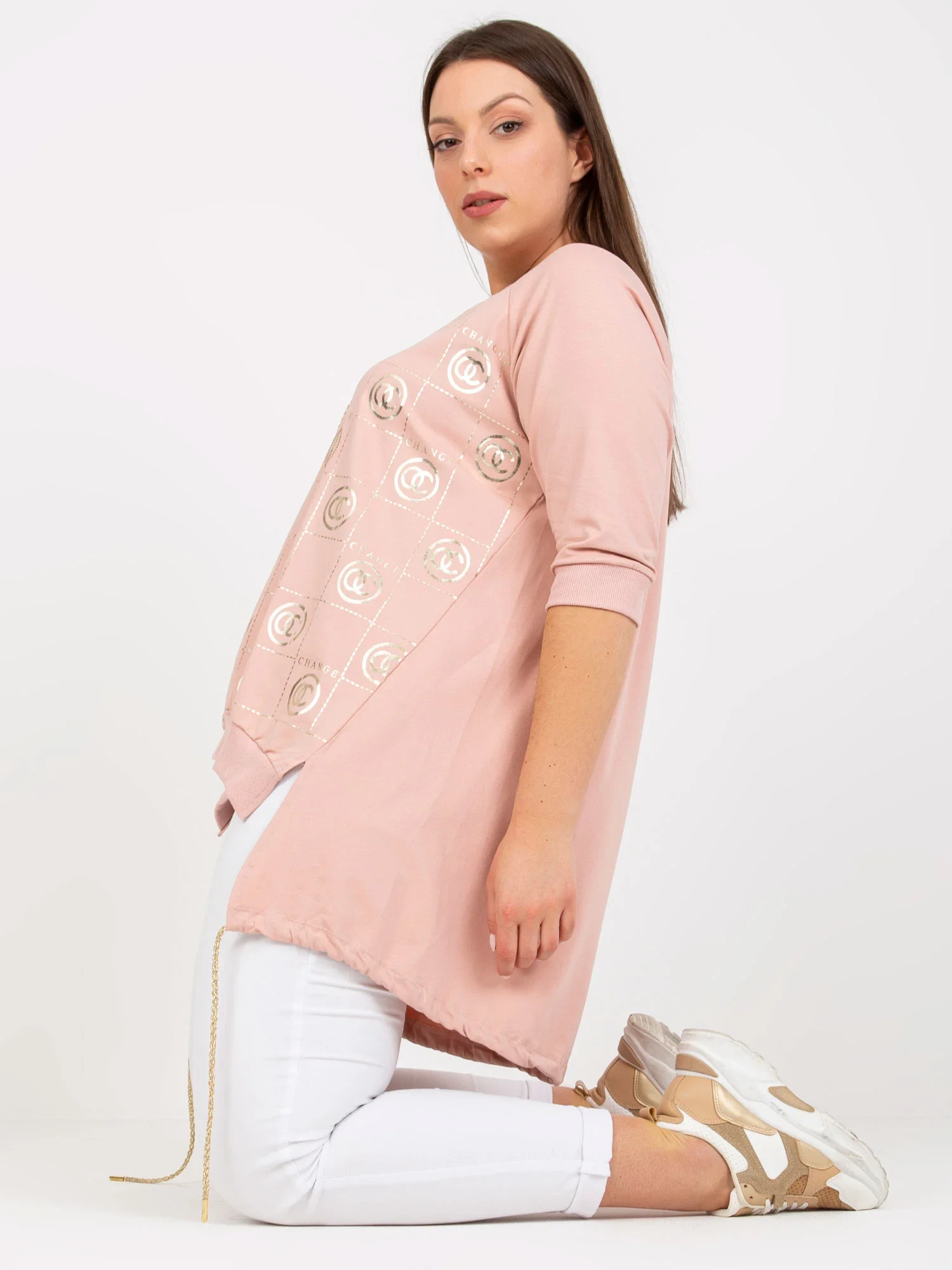 Modelka má na sobě jednu velikost. Rozměry modelky: výška 176 cm, poprsí 104 cm, pas 87 cm, boky 119 cm.