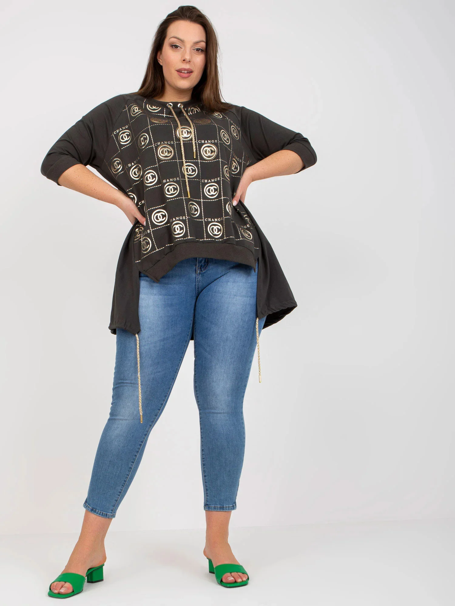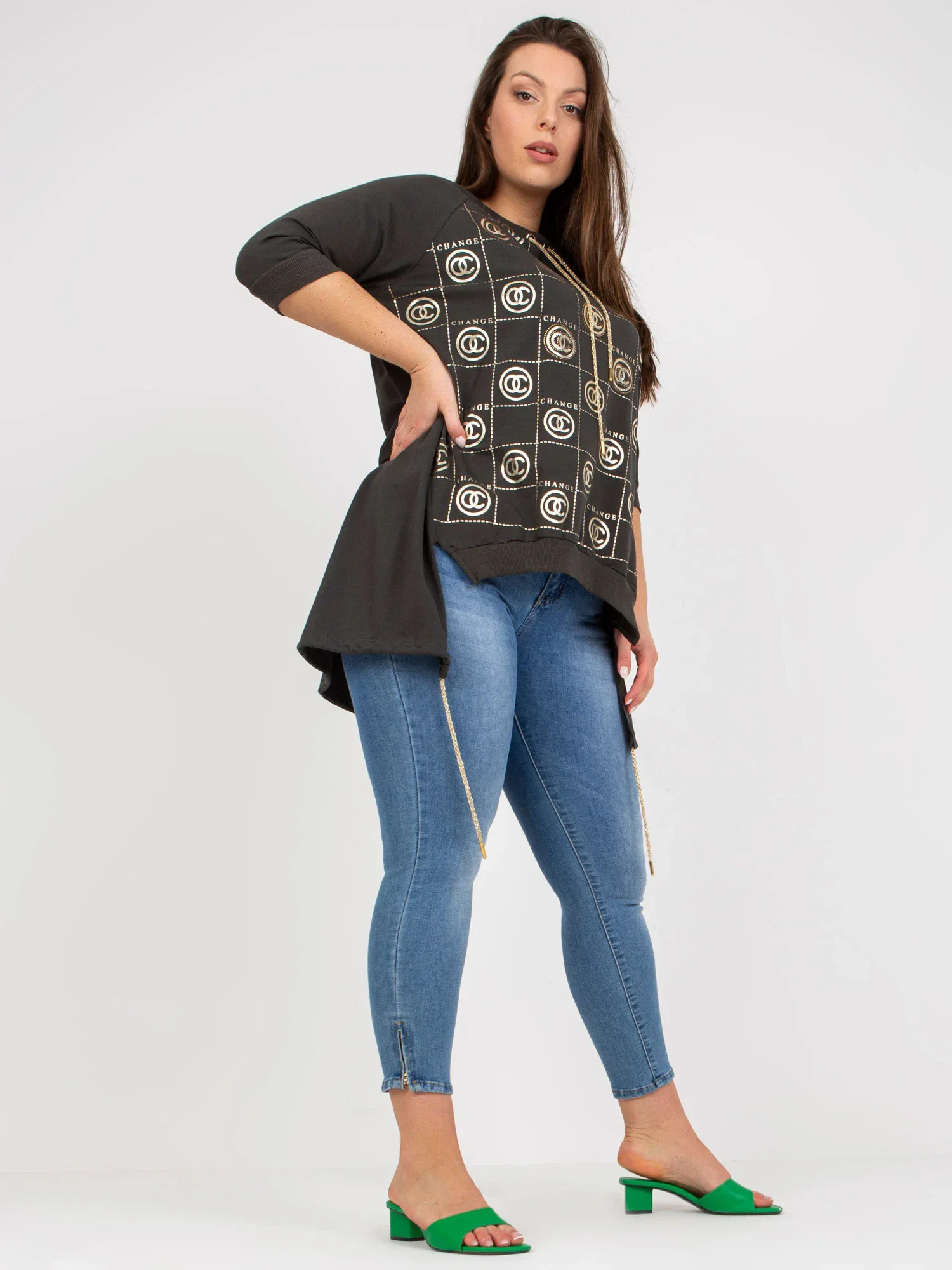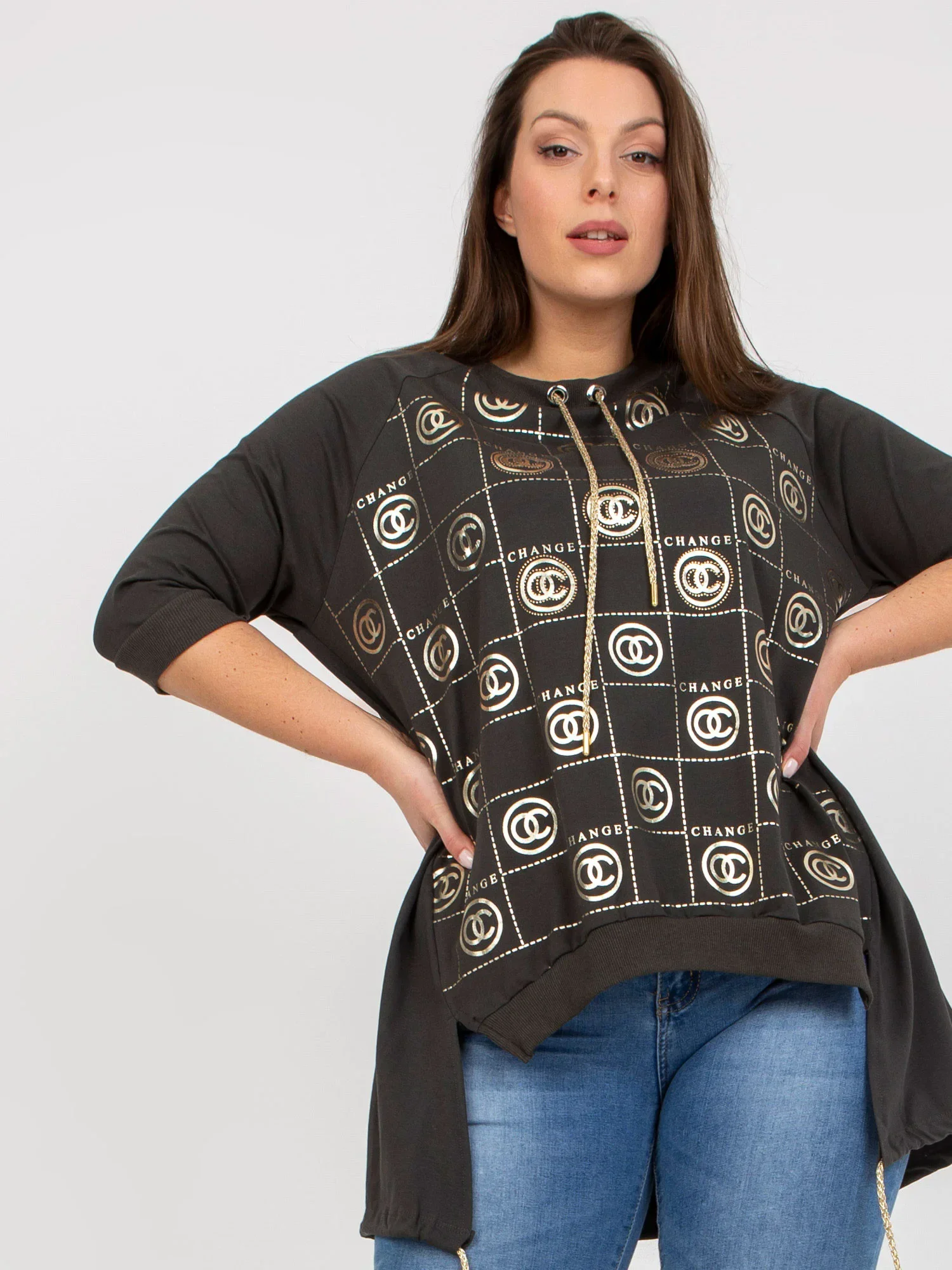Modelka má na sobě jednu velikost. Rozměry modelky: výška 176 cm, poprsí 104 cm, pas 87 cm, boky 119 cm.