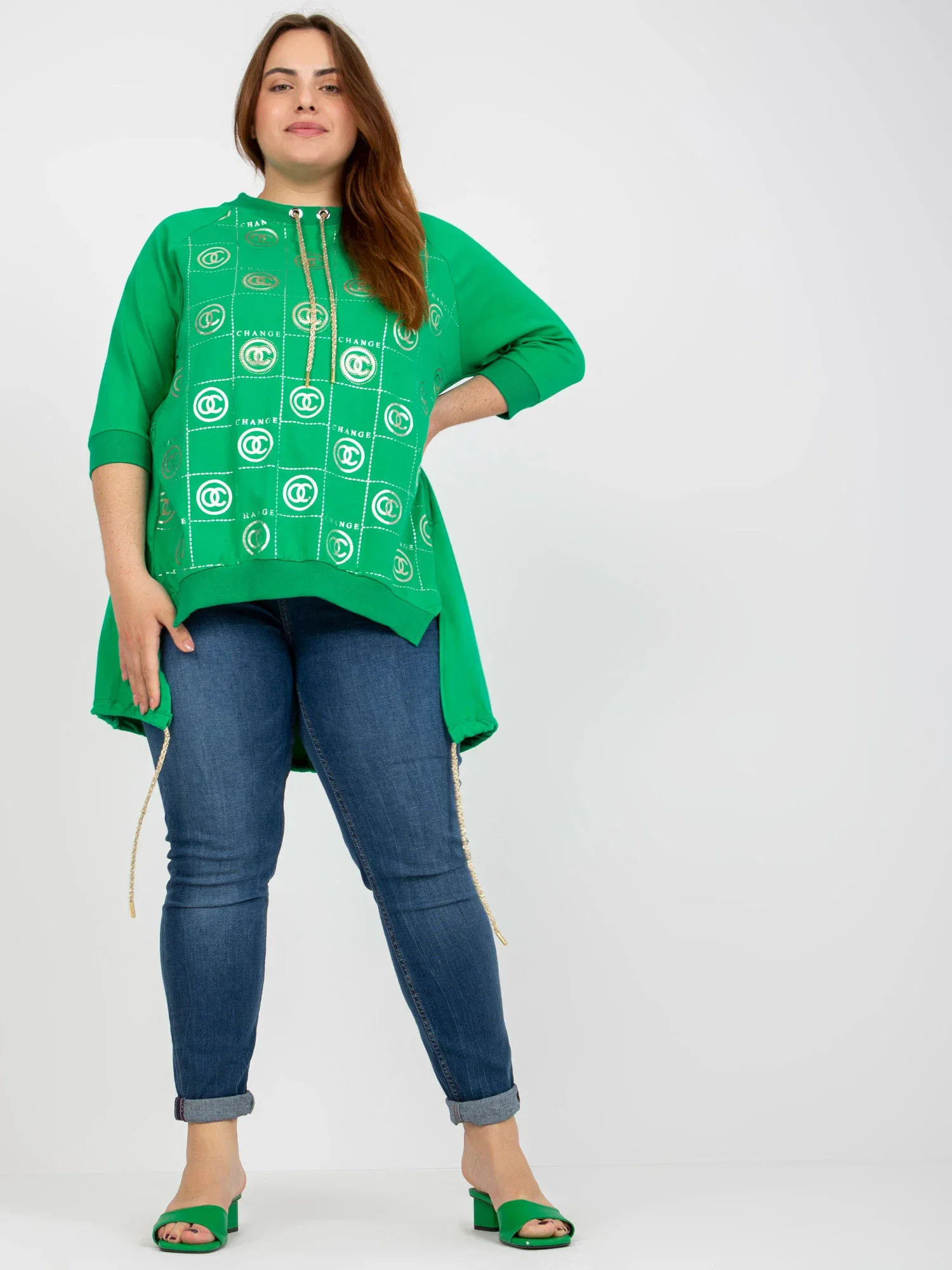 Modelka má na sobě jednu velikost. Rozměry modelky: výška 170 cm, prsa 108 cm, pas 86 cm, boky 120 cm.