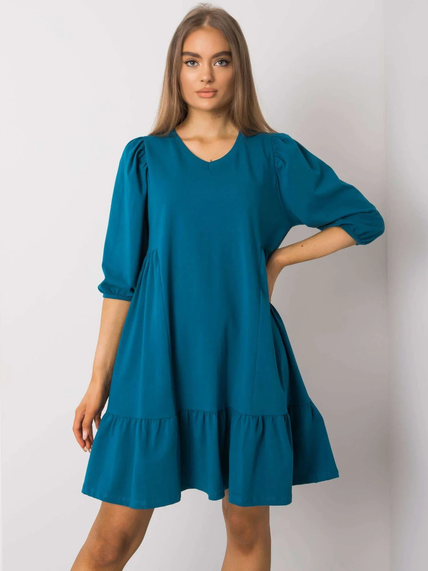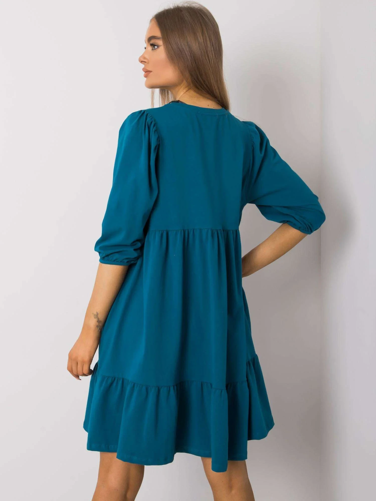 Rozměry šatů ve velikosti S/M měřené na plocho: šířka v podpaží - 46 cm, celková délka - 86 cm, délka rukávu - 37 cm