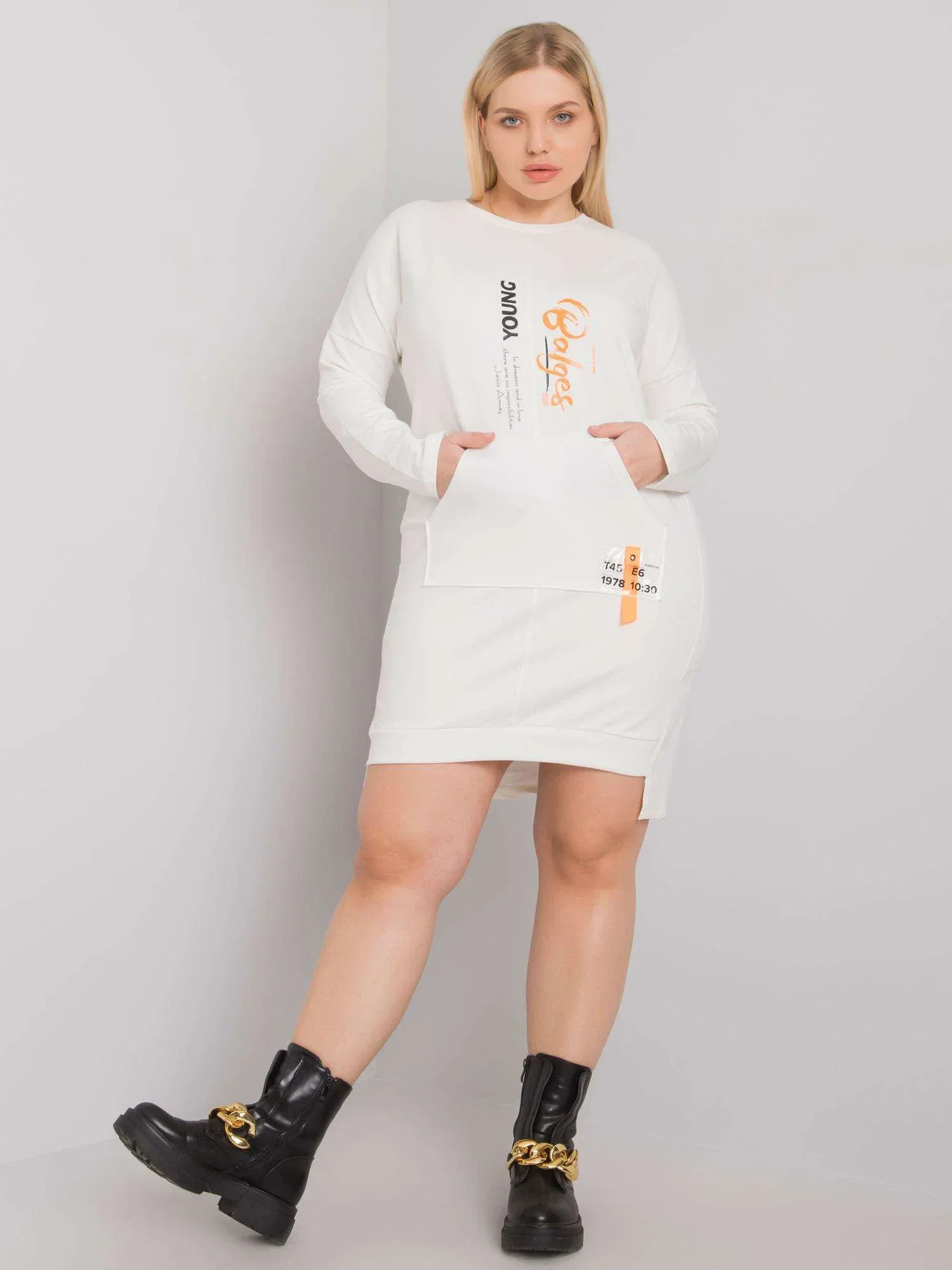 Dámské plus size šaty v barvě ecru s kapsami.