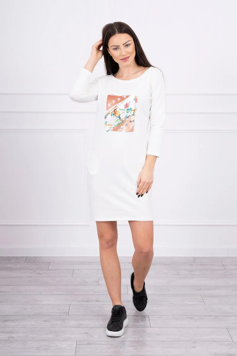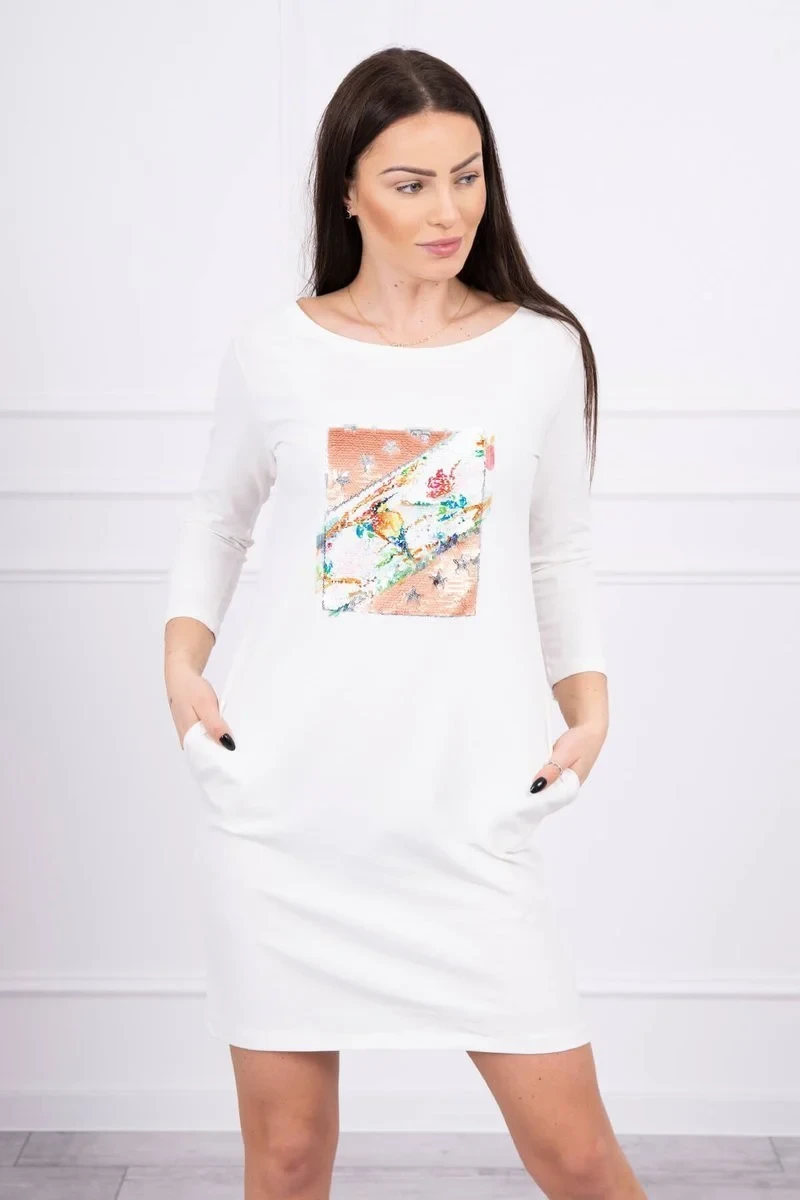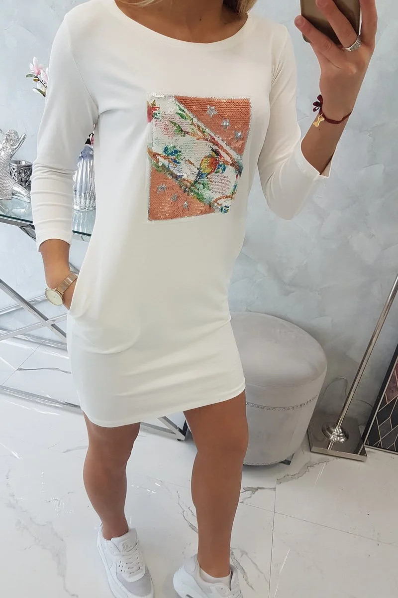 Představujeme vám módní šaty. Šaty mají na přední straně našitou grafiku z flitrů. Šaty mají kapsy. Ideální pro každodenní použití. Šaty jsou vyrobeny z vysoce kvalitního materiálu. Velikost je univerzální a vyhovuje dámám, které nosí velikost S, M nebo L.