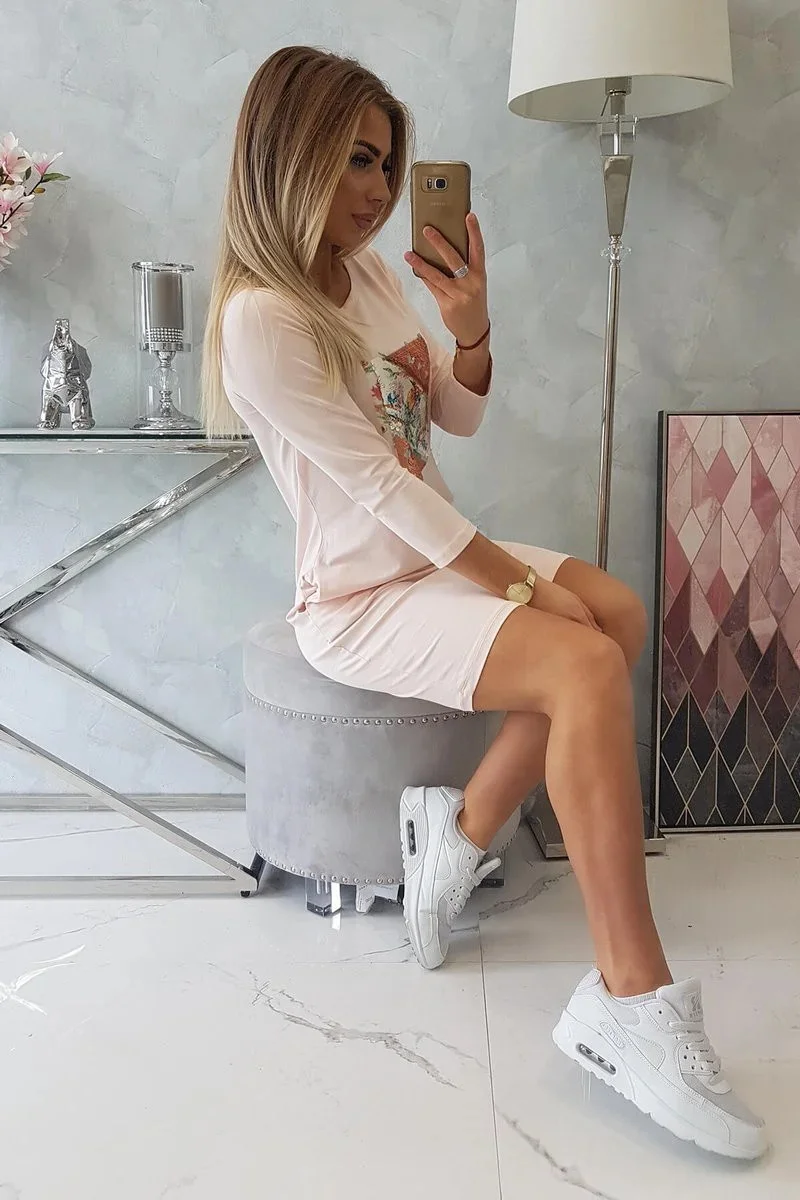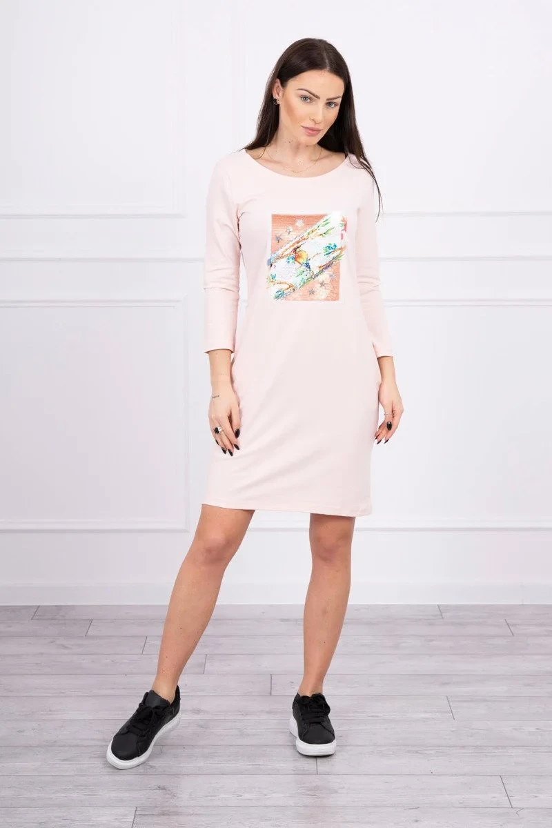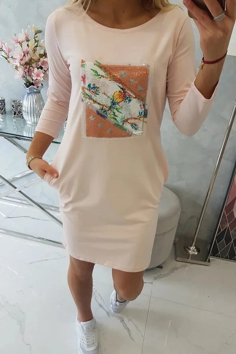 Představujeme vám módní šaty. Šaty mají na přední straně našitou grafiku z flitrů. Šaty mají kapsy. Ideální pro každodenní použití. Šaty jsou vyrobeny z vysoce kvalitního materiálu. Velikost je univerzální a vyhovuje dámám, které nosí velikost S, M nebo L.