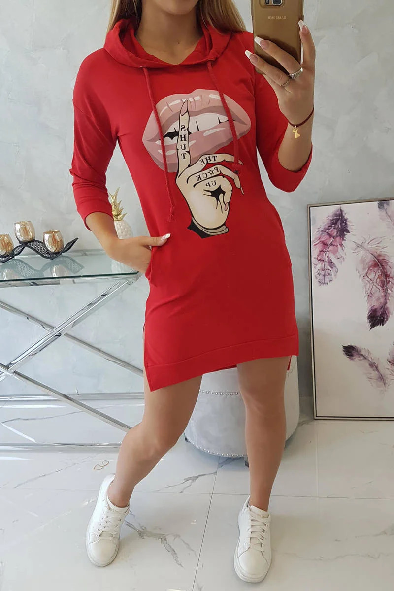 Představujeme vám pohodlné šaty. Šaty s kapucí a módním barevným potiskem. Šaty s delšími zády. Velmi zajímavá nabídka pro všechny dámy. Šaty jsou vyrobeny z vysoce kvalitního materiálu. Velikost je univerzální a vyhovuje dámám, které nosí velikost S, M nebo L.