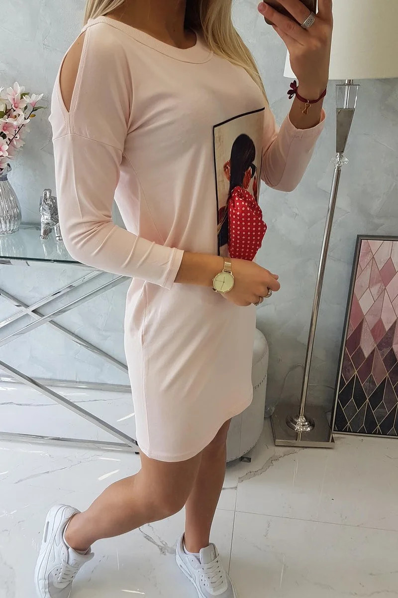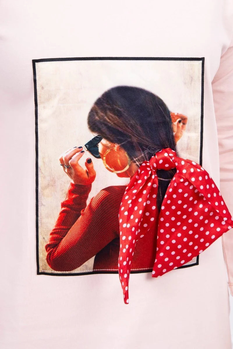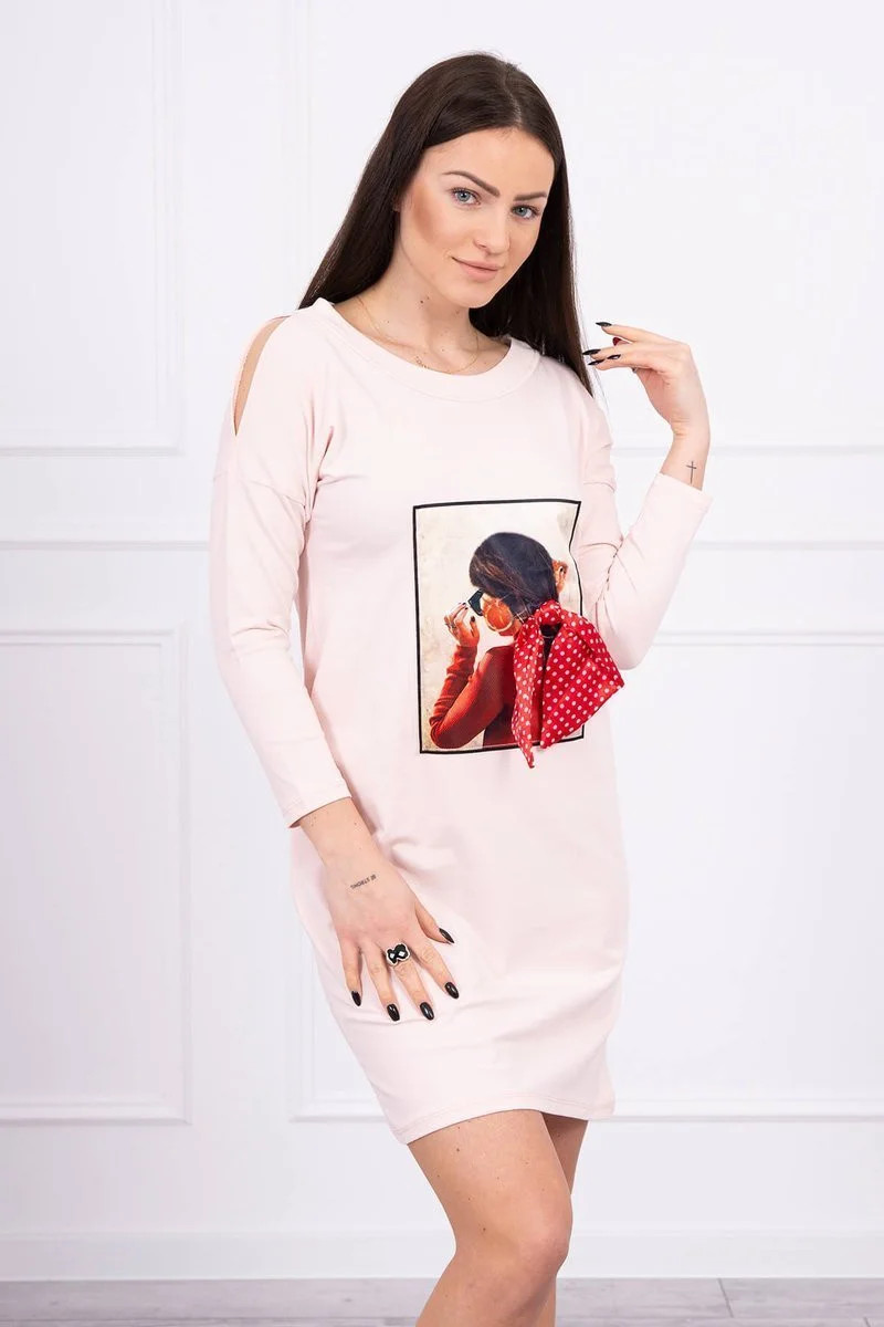 Šaty s grafikou a 3D model 18744094 mašlí pudrově růžové - K-Fashion