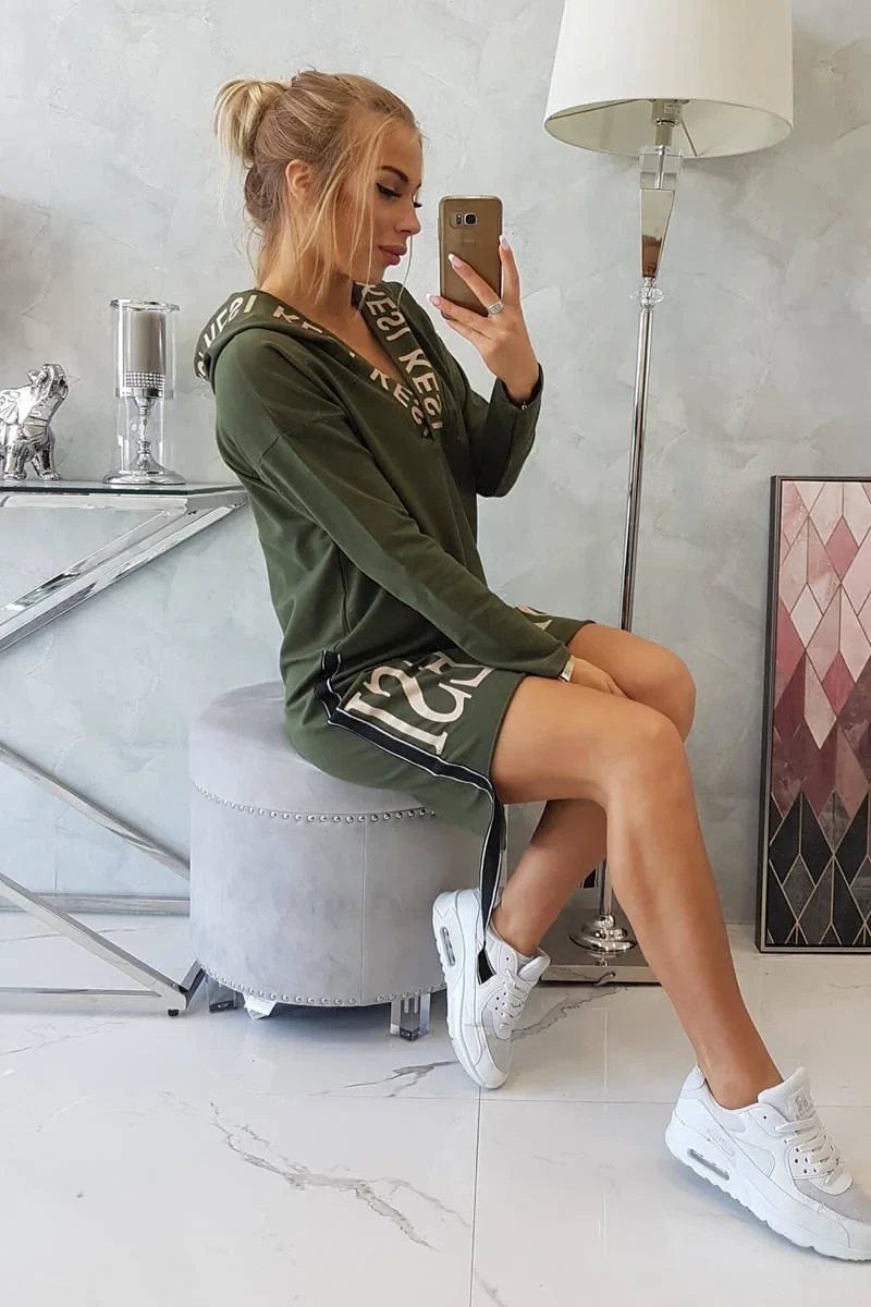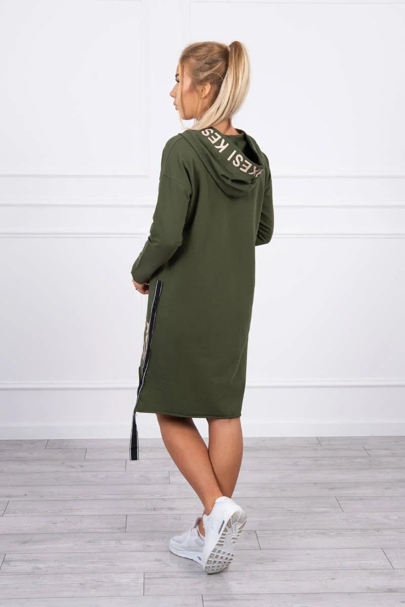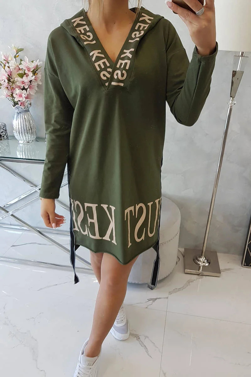 Šaty s kapucí a khaki potiskem