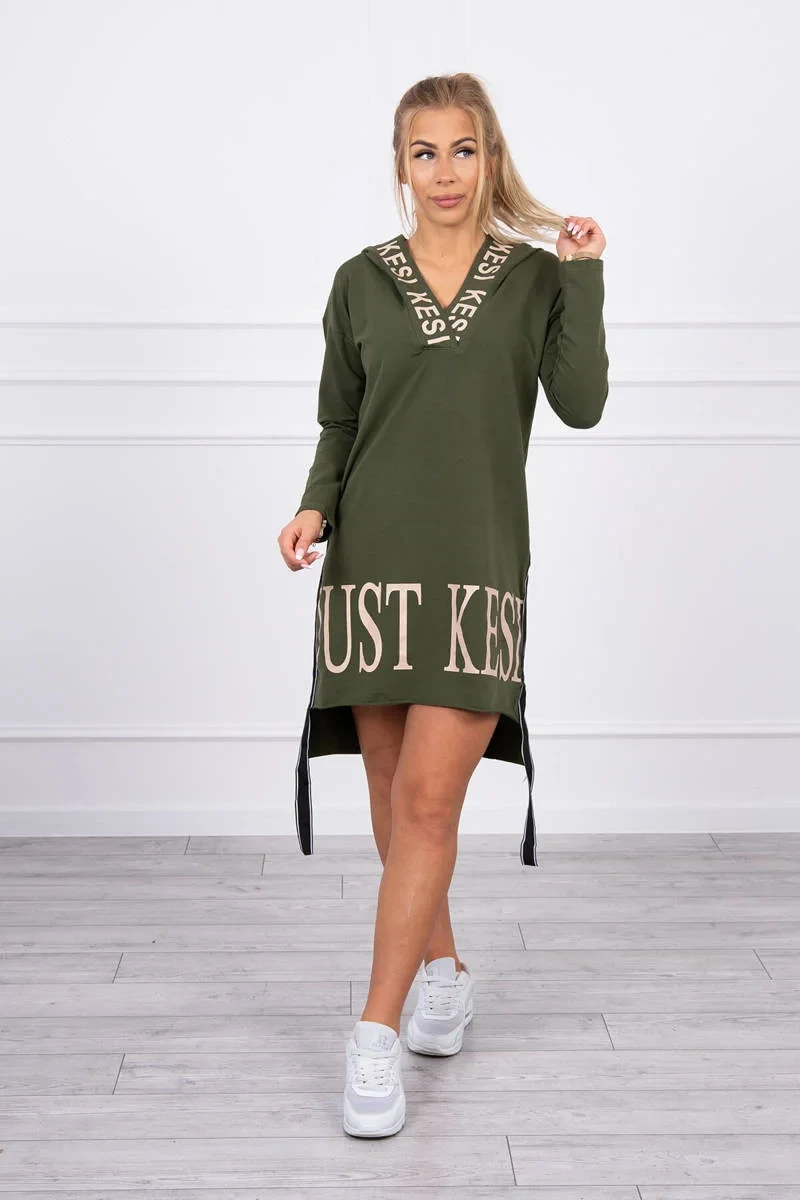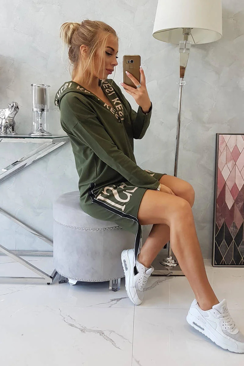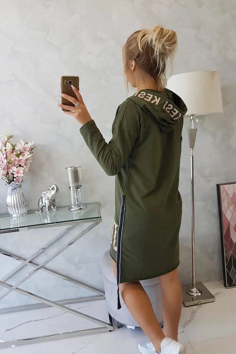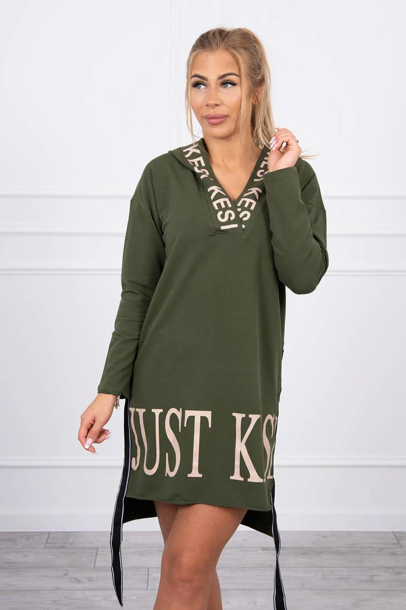 Šaty s kapucí a khaki potiskem