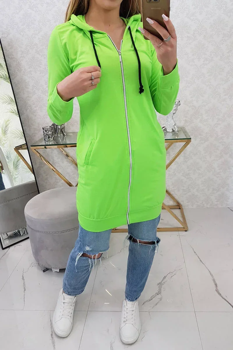 Představujeme vám pohodlnou dlouhou mikinu s kapucí. Mikina má zapínání na zip. Mikina je vyrobena z vysoce kvalitního materiálu. Velikost je univerzální a vyhovuje dámám, které nosí velikost S, M nebo L.