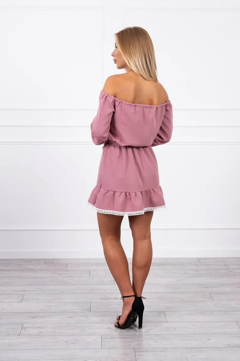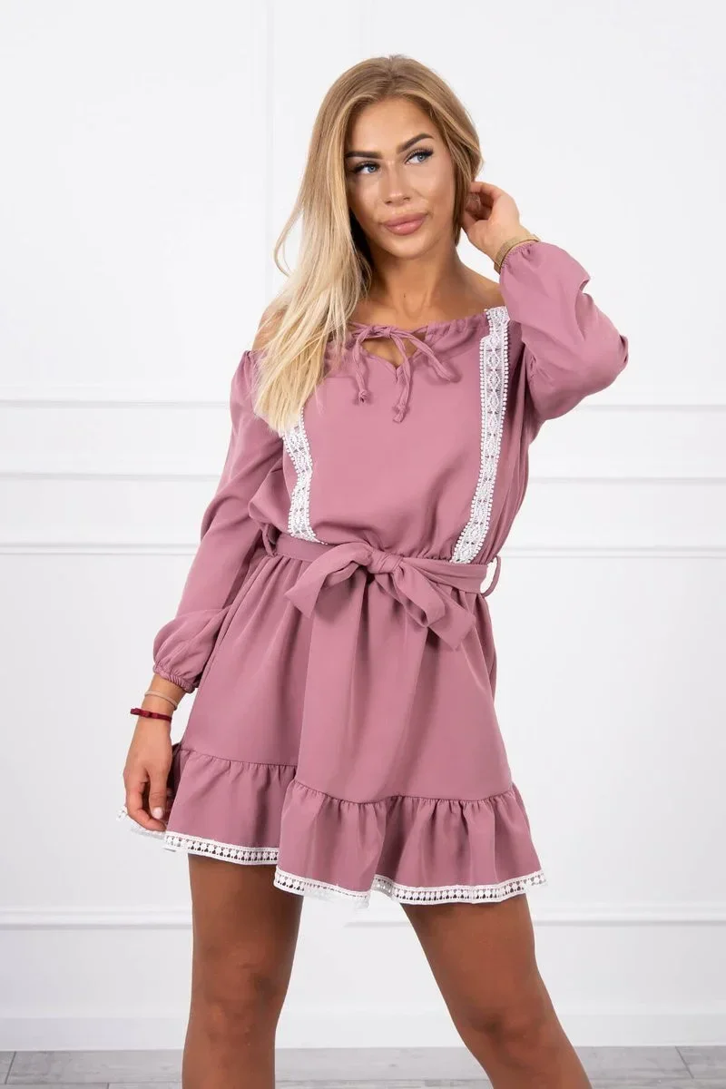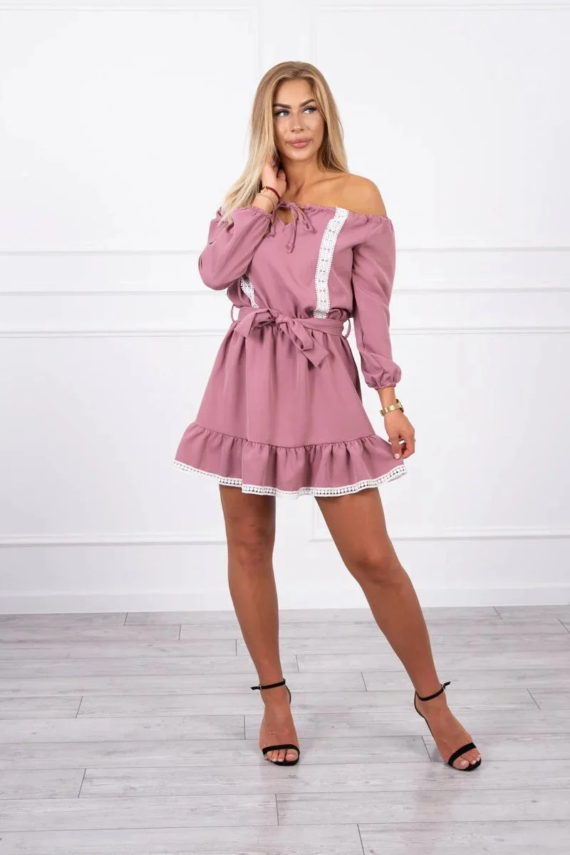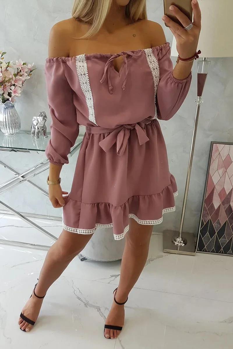 Šaty s odhalenými rameny a krajkou tmavě růžové barvy