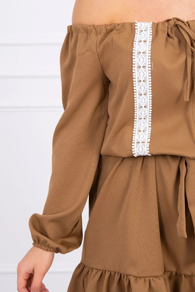 Šaty s otevřenými rameny a krajkou camel
