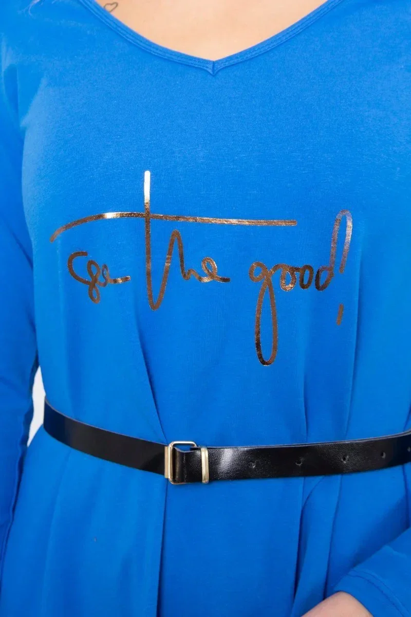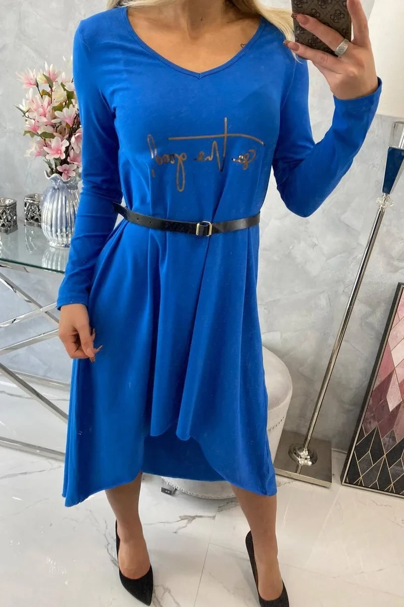 Představujeme vám pohodlné šaty s ozdobným páskem a módním nápisem na přední straně. Šaty mají delší záda. Šaty jsou vyrobeny z vysoce kvalitního materiálu. Velmi zajímavá nabídka pro všechny dámy. Velikost je univerzální a vyhovuje dámám, které nosí velikost S, M nebo L.