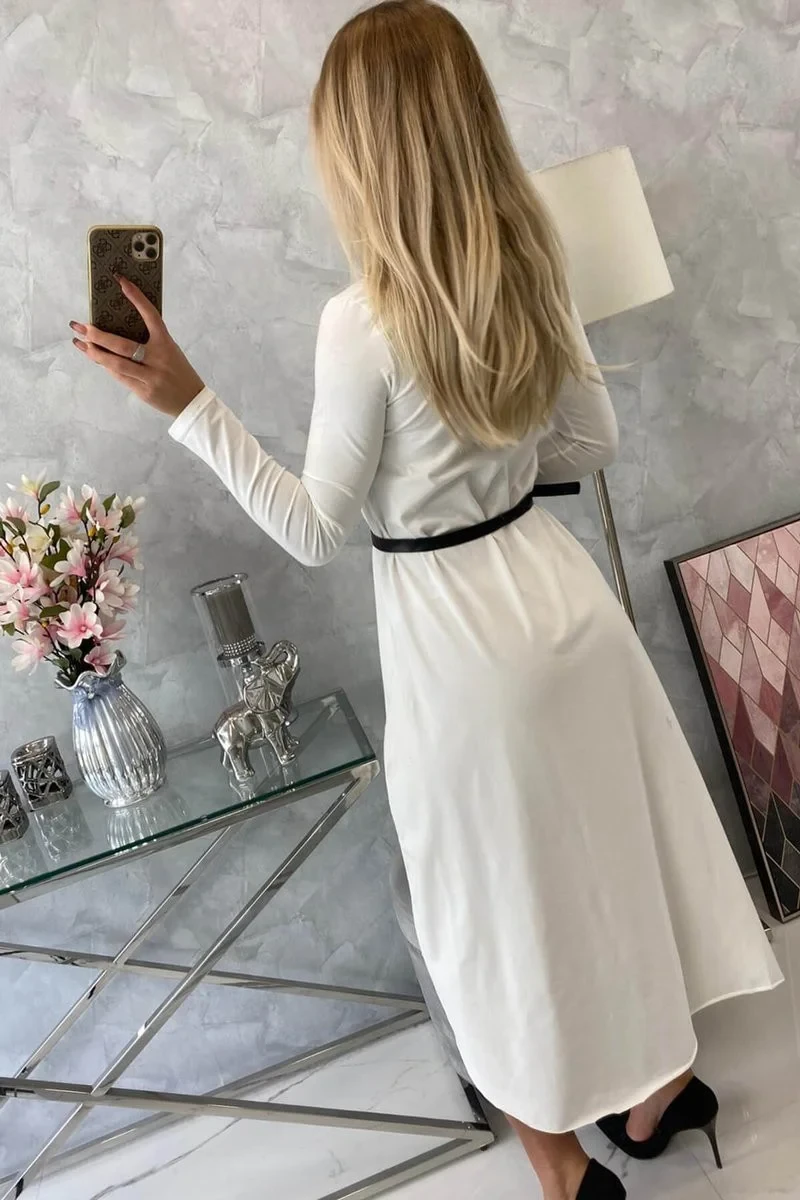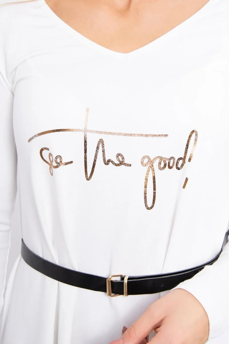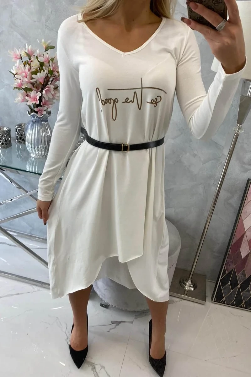 Prezentujemy Państwu wygodną sukienkę z ozdobnym paskiem oraz modnym napisem z przodu. Sukienka posiada dłuższy tył. Sukienka wykonana jest z wysokiej jakości materiału. Bardzo ciekawa propozycja dla wszystkich Pań. Rozmiar jest uniwersalny i będzie odpowiedni dla Pań noszących rozmiar S, M lub L.