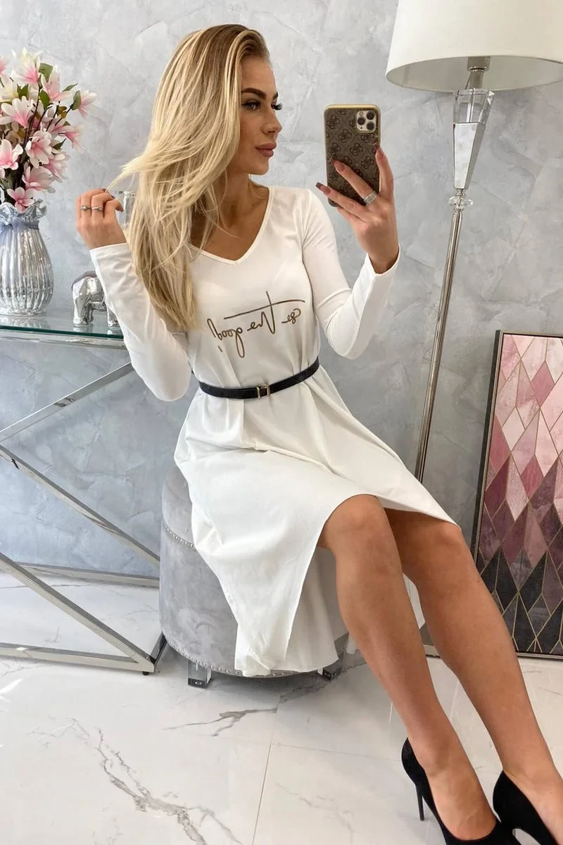 Šaty s ozdobným páskem a nápisem ecru