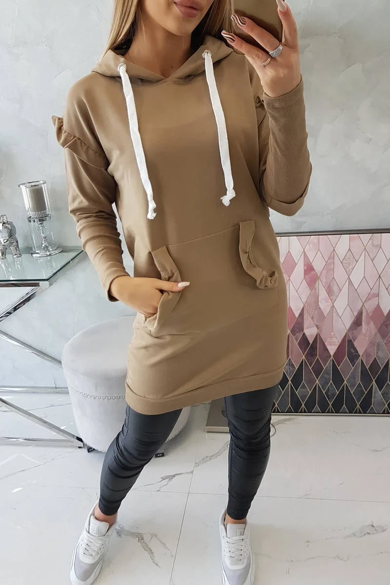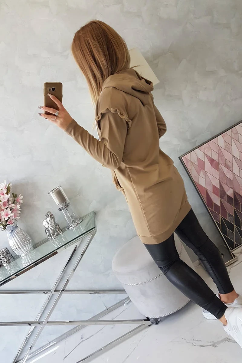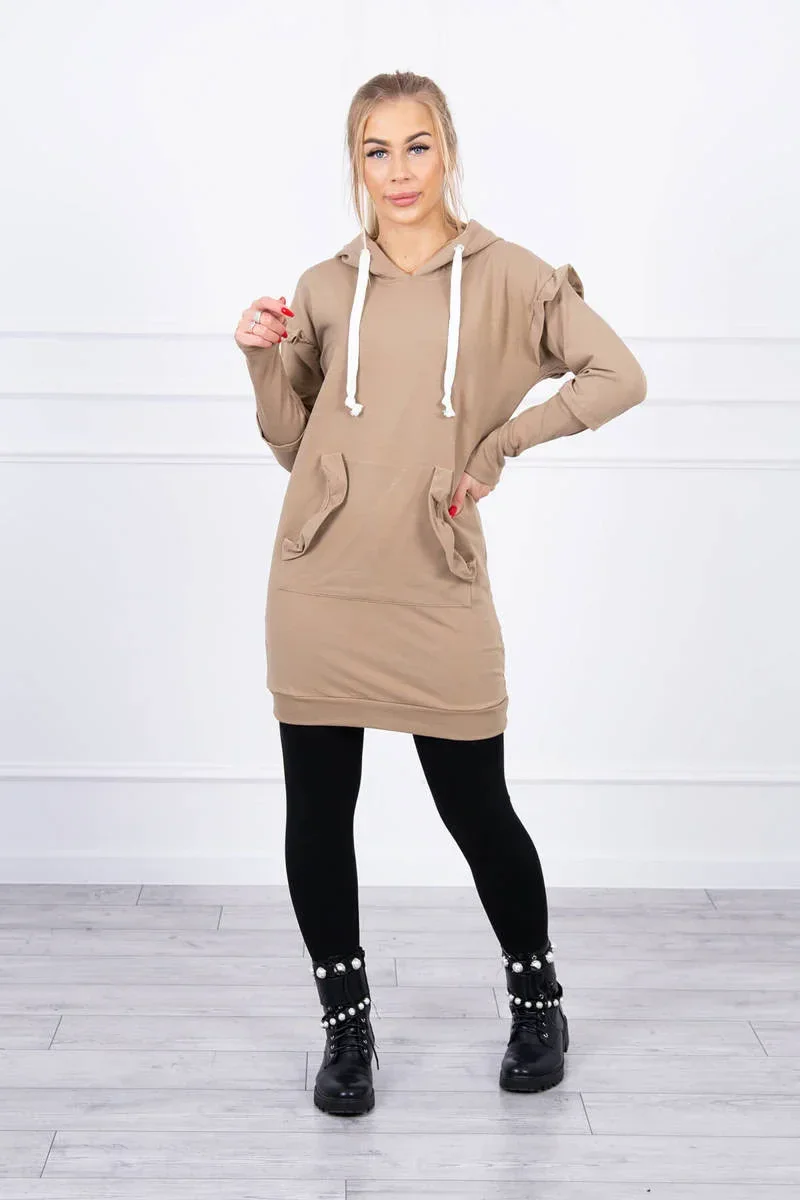 Šaty s ozdobnými volánky a kapucí camel