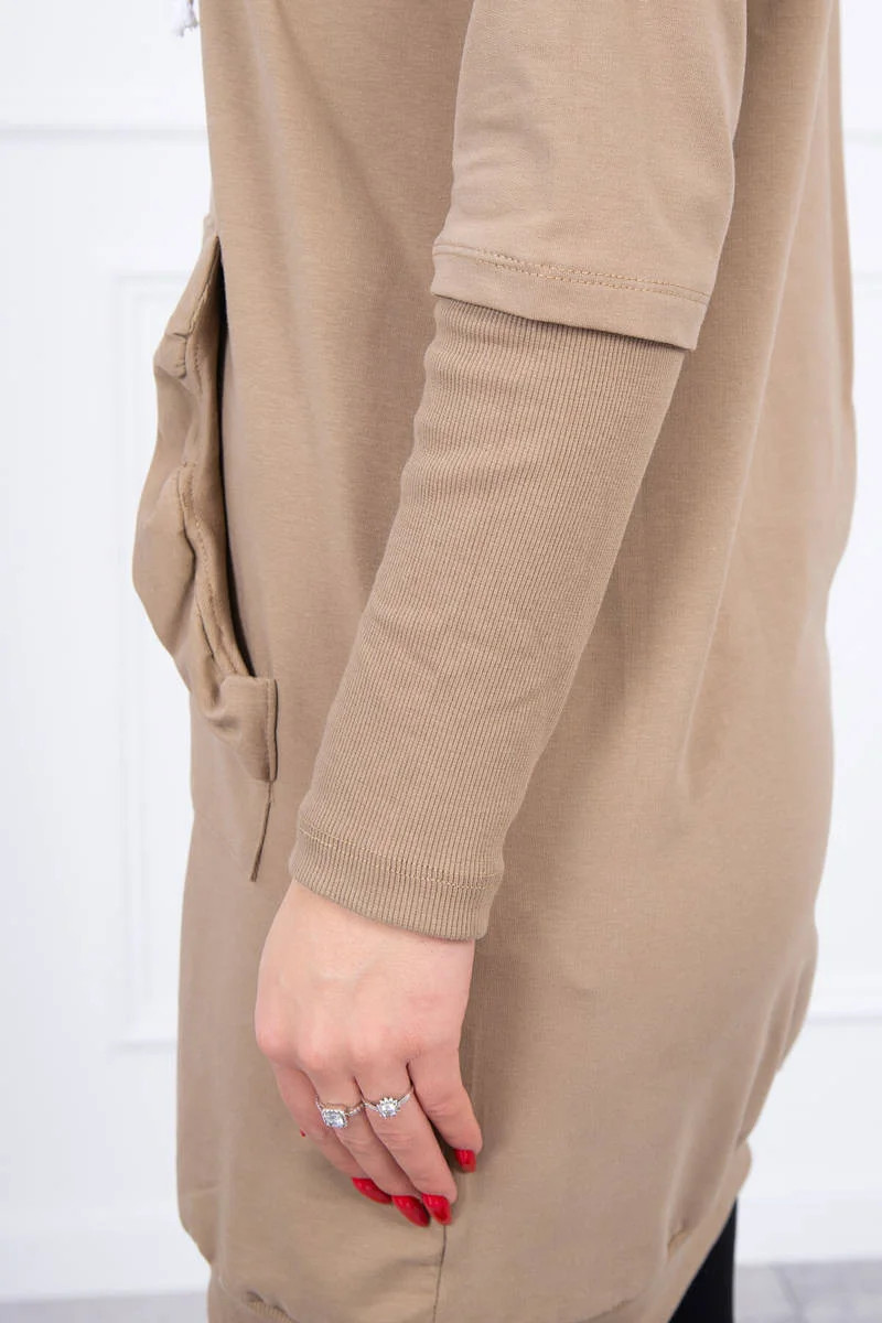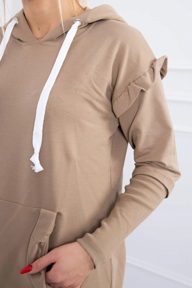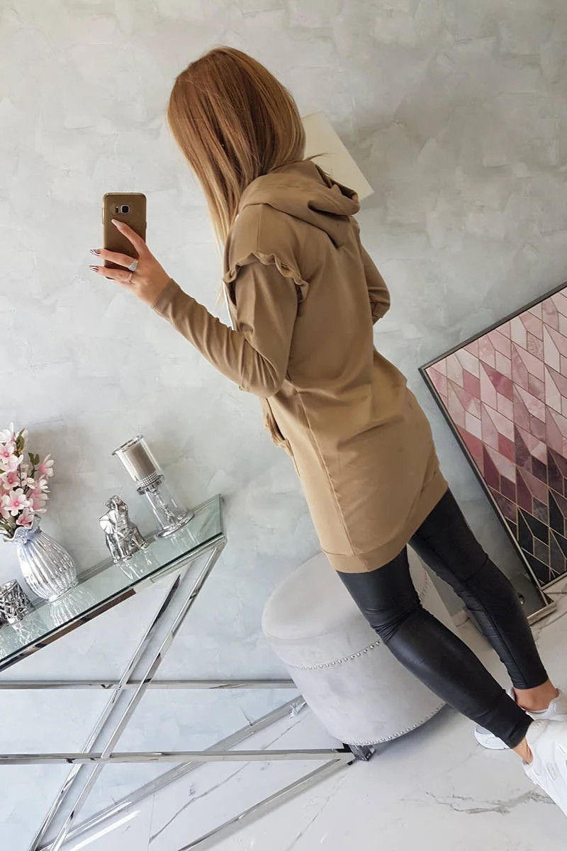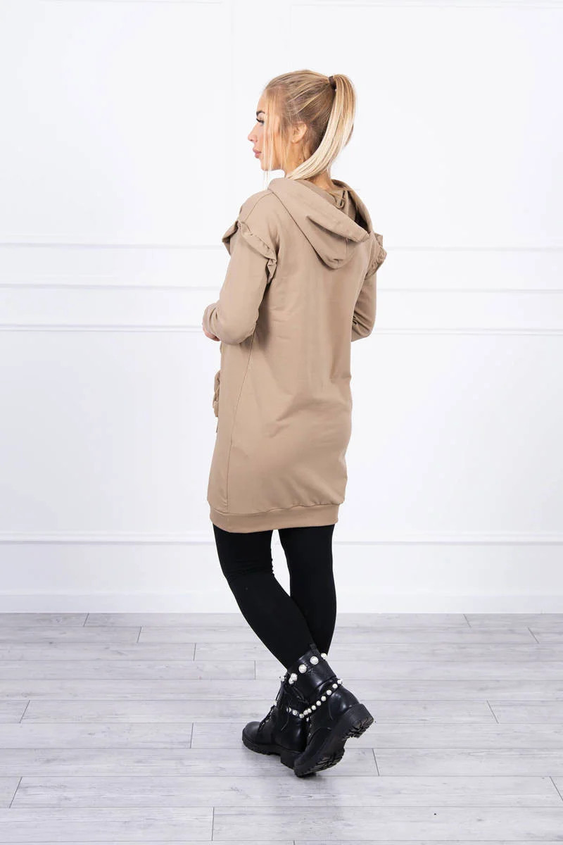 Šaty s ozdobnými volánky a kapucí camel
