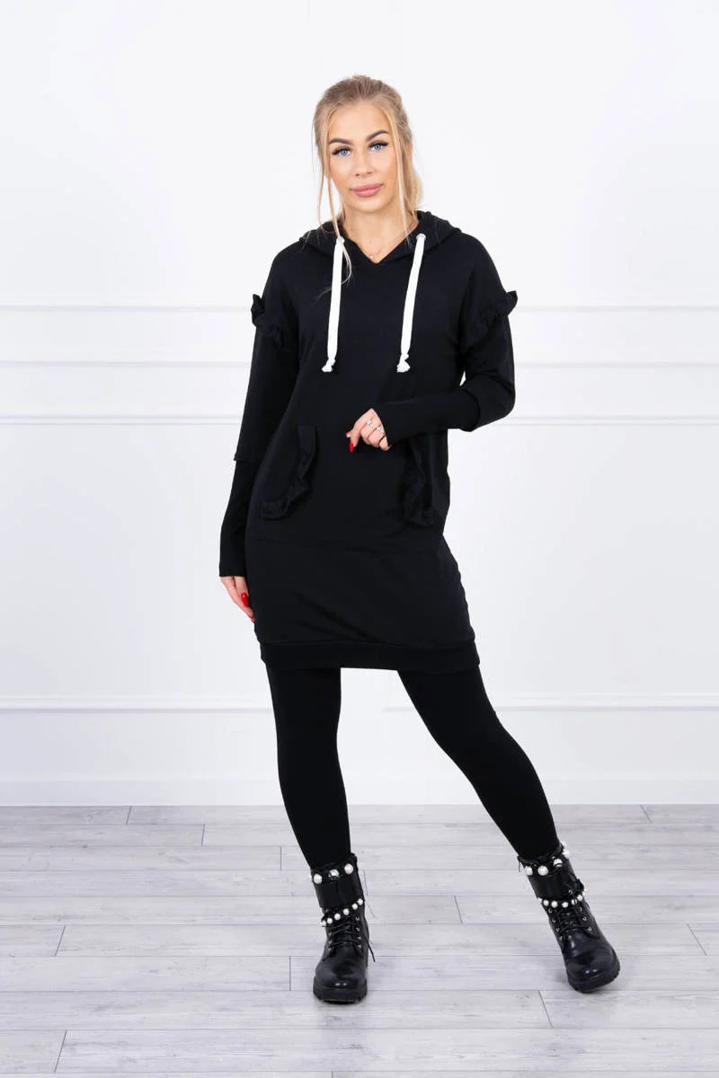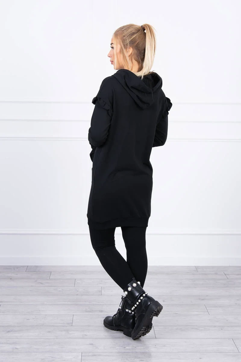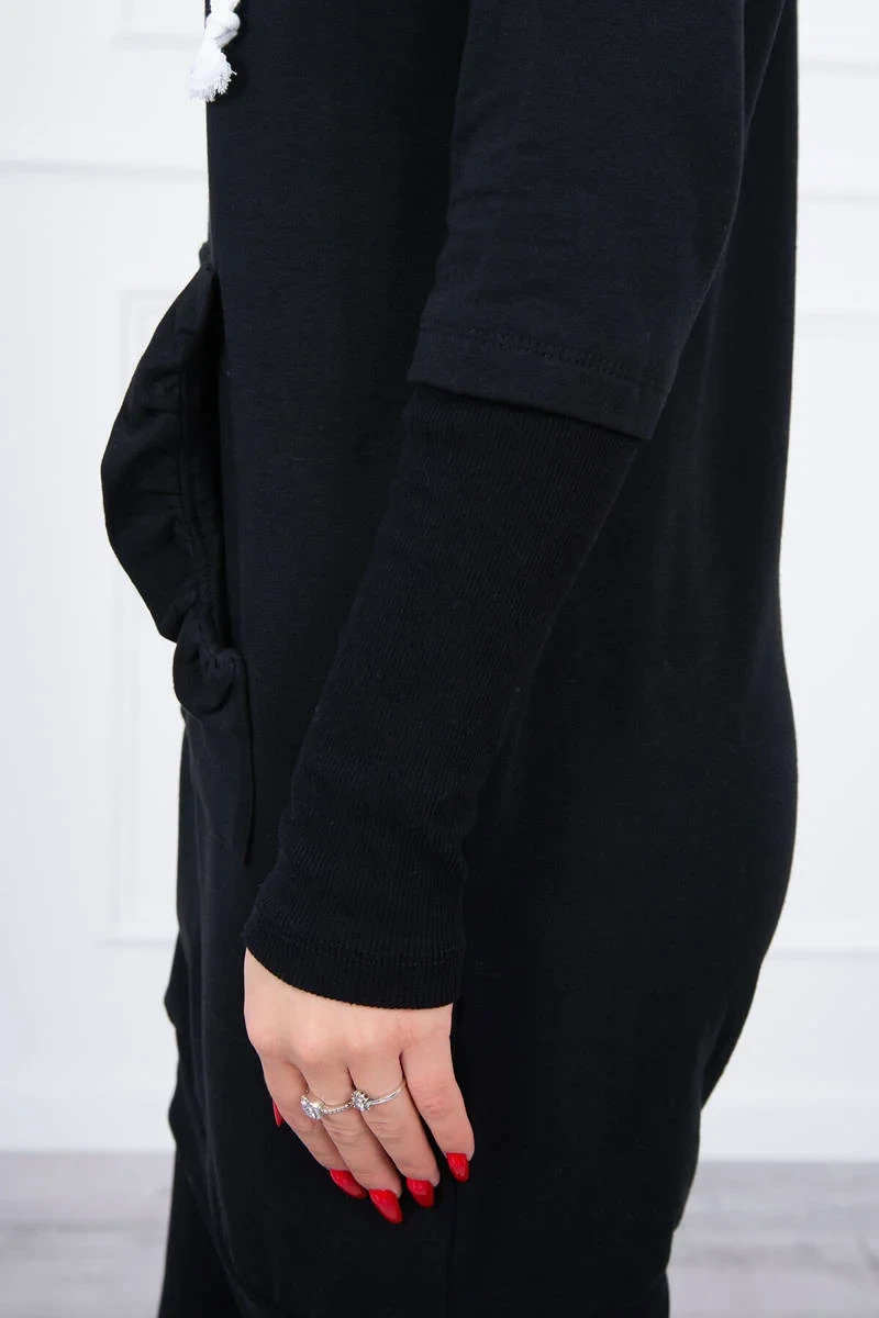 Šaty s ozdobnými volánky a kapucí černé barvy