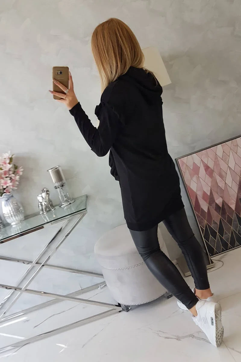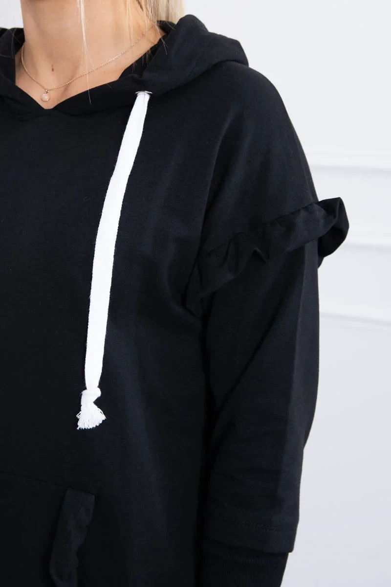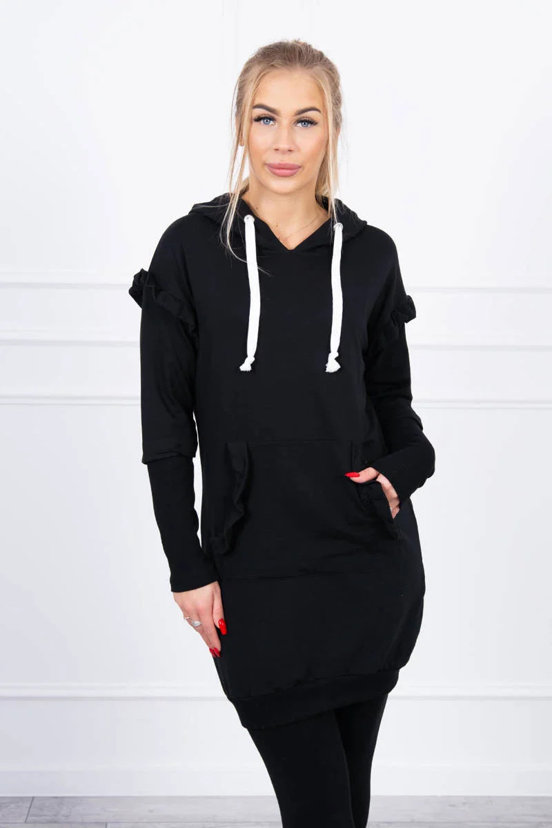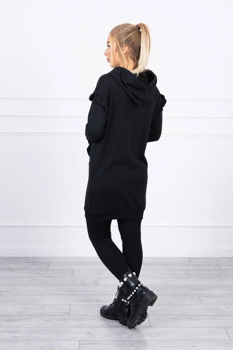 Šaty s ozdobnými volánky a kapucí černé barvy