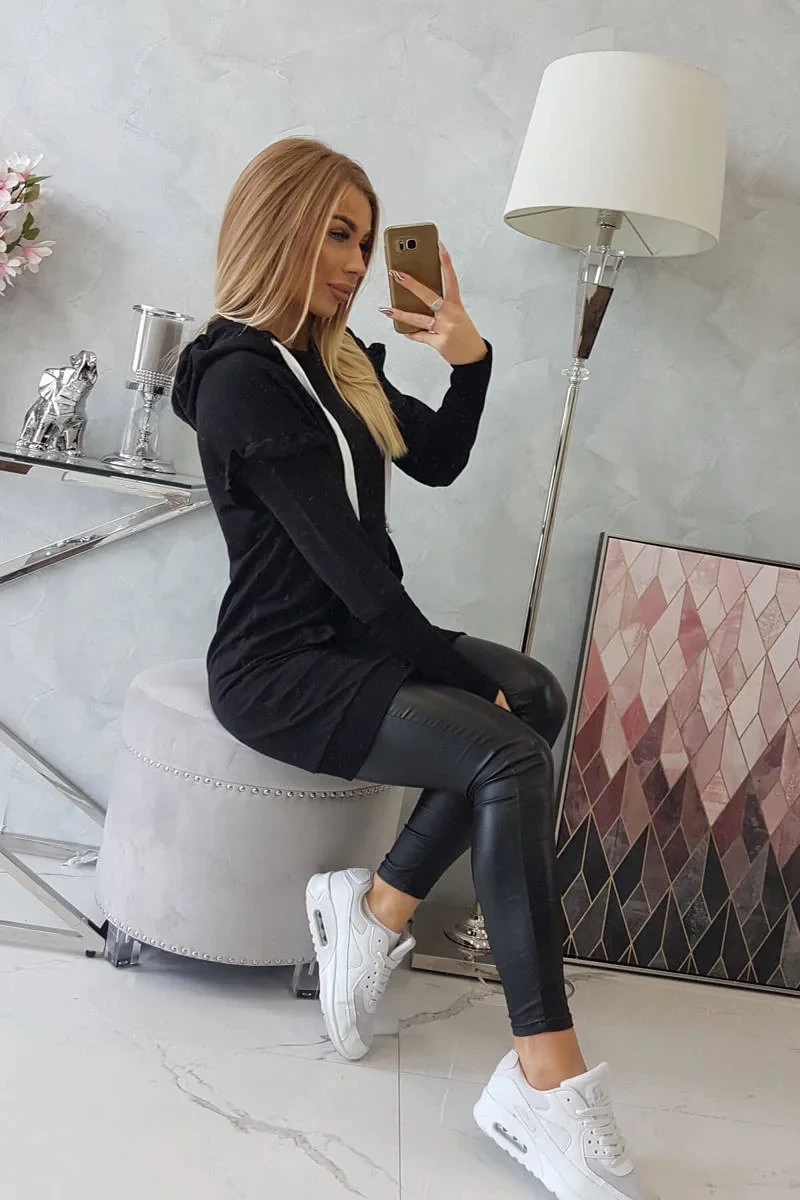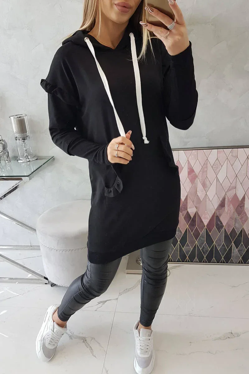 Představujeme vám módní šaty. Šaty mají kapuci a kapsu na přední straně. Šaty mají ozdobné volánky na rukávech a na kapse. Ideální každodenní poloha. Šaty jsou vyrobeny z vysoce kvalitního materiálu. Velikost je univerzální a vyhovuje dámám, které nosí velikost M, L nebo XL