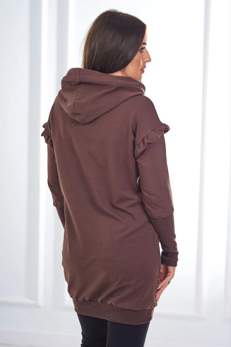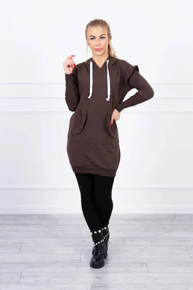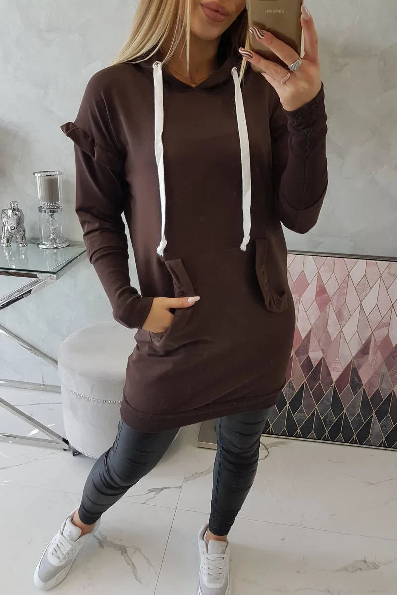 Šaty s ozdobnými volánky a kapucí v hnědé barvě