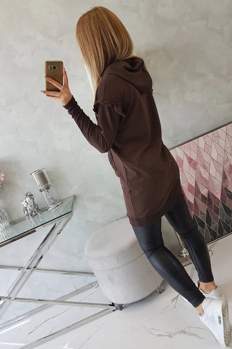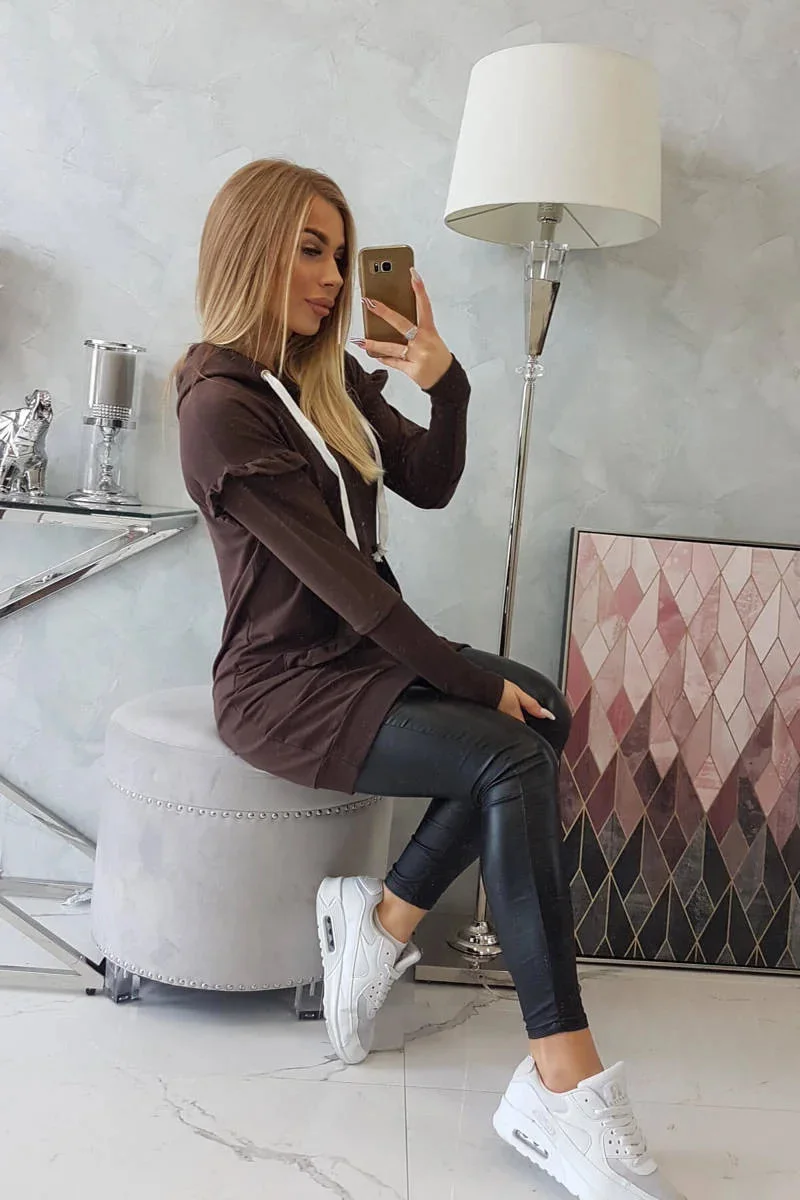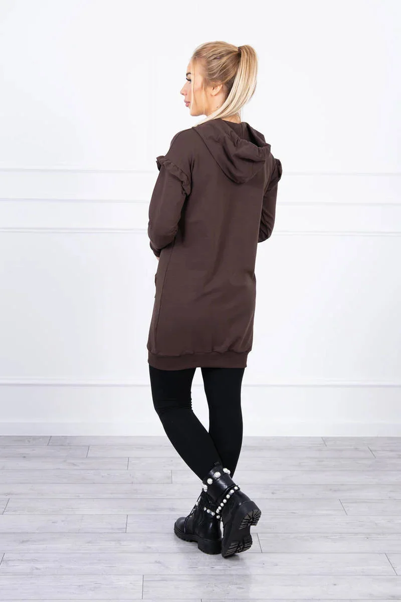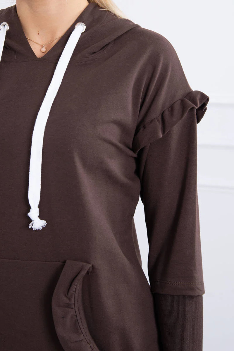 Šaty s ozdobnými volánky a kapucí v hnědé barvě