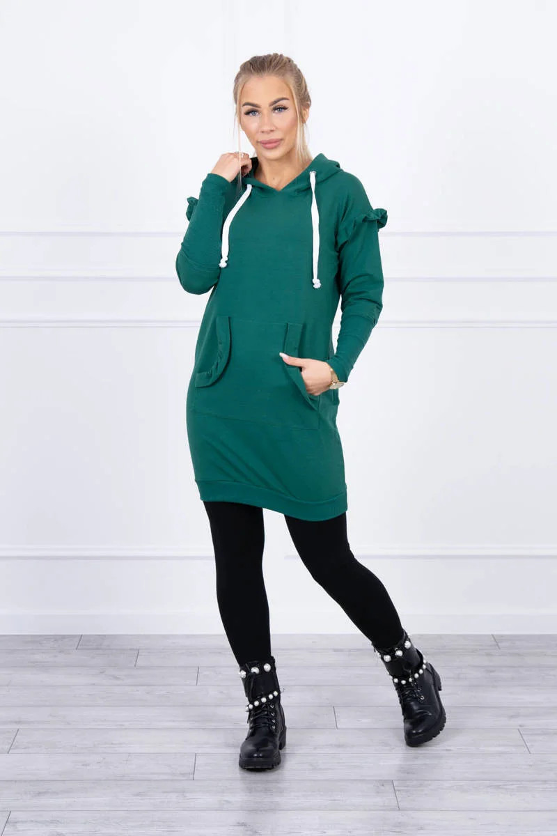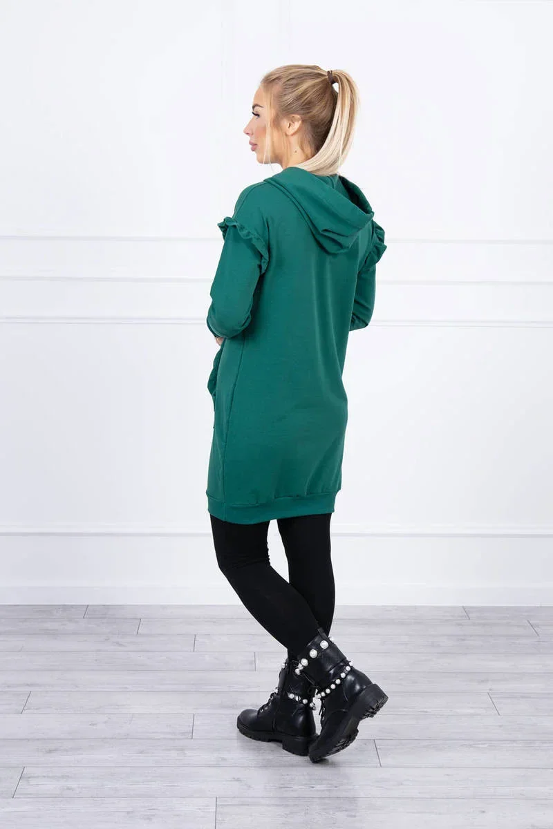 Šaty s ozdobnými volánky a kapucí zelené barvy