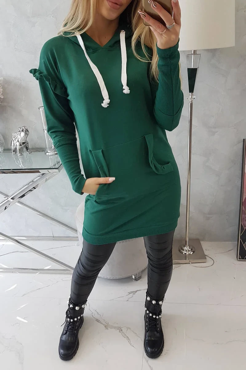 Představujeme vám módní šaty. Šaty mají kapuci a kapsu na přední straně. Šaty mají ozdobné volánky na rukávech a na kapse. Ideální každodenní poloha. Šaty jsou vyrobeny z vysoce kvalitního materiálu. Velikost je univerzální a vyhovuje dámám, které nosí velikost M, L nebo XL