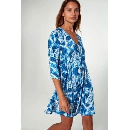 Kaftan s potiskem, zapínáním na knoflíky, volánovými rukávy a výstřihem do V, volného střihu. Světlý a chladivý, bude vaší jasnou volbou na letní dovolené.