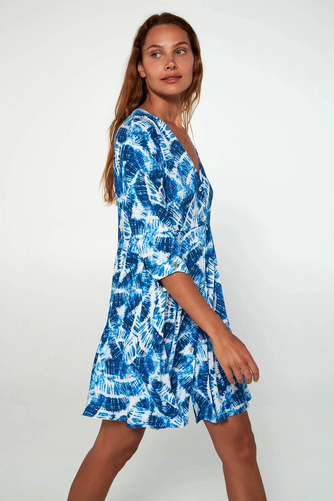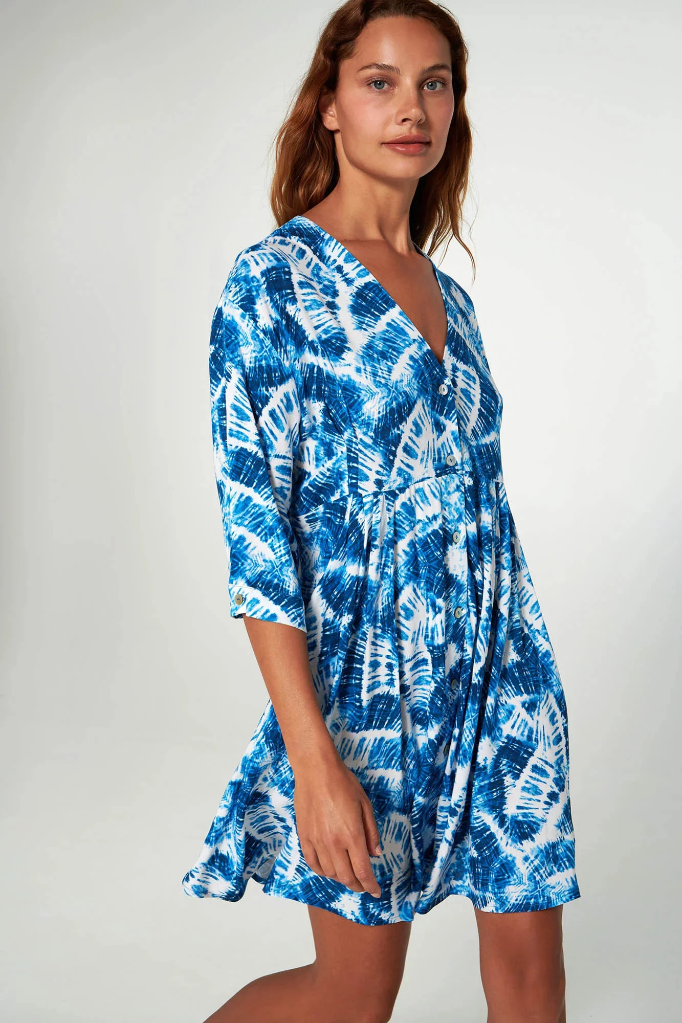 Kaftan s potiskem, zapínáním na knoflíky, volánovými rukávy a výstřihem do V, volného střihu. Světlý a chladivý, bude vaší jasnou volbou na letní dovolené.