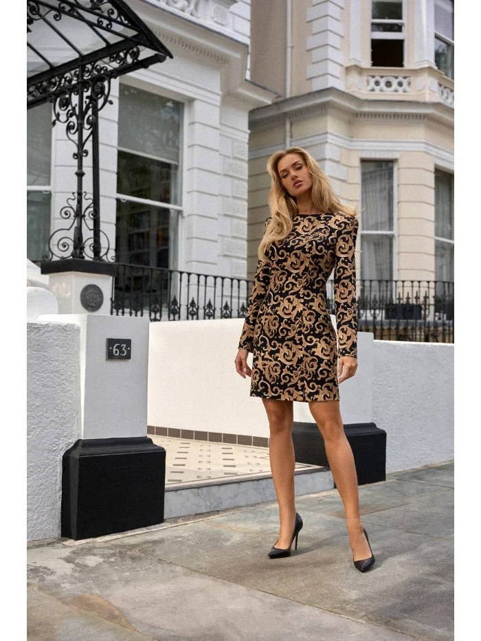 95% polyester 5% elastan INFORMACE O PRODUKTU: tkaná látka s potiskem pouzdrové šaty s modelujícím prošíváním dlouhé rukávy s vycpanými rameny krátké nohavice rozdělené na mini délku skrytý zadní zip bez podšívky naše modelka je vysoká 171 cm a nosí velikost S Navrženo a vyrobeno v Polsku