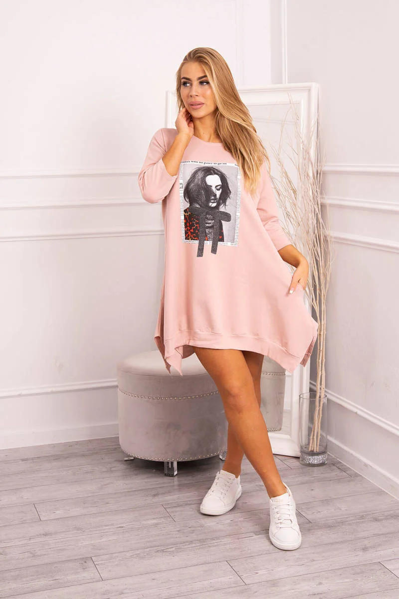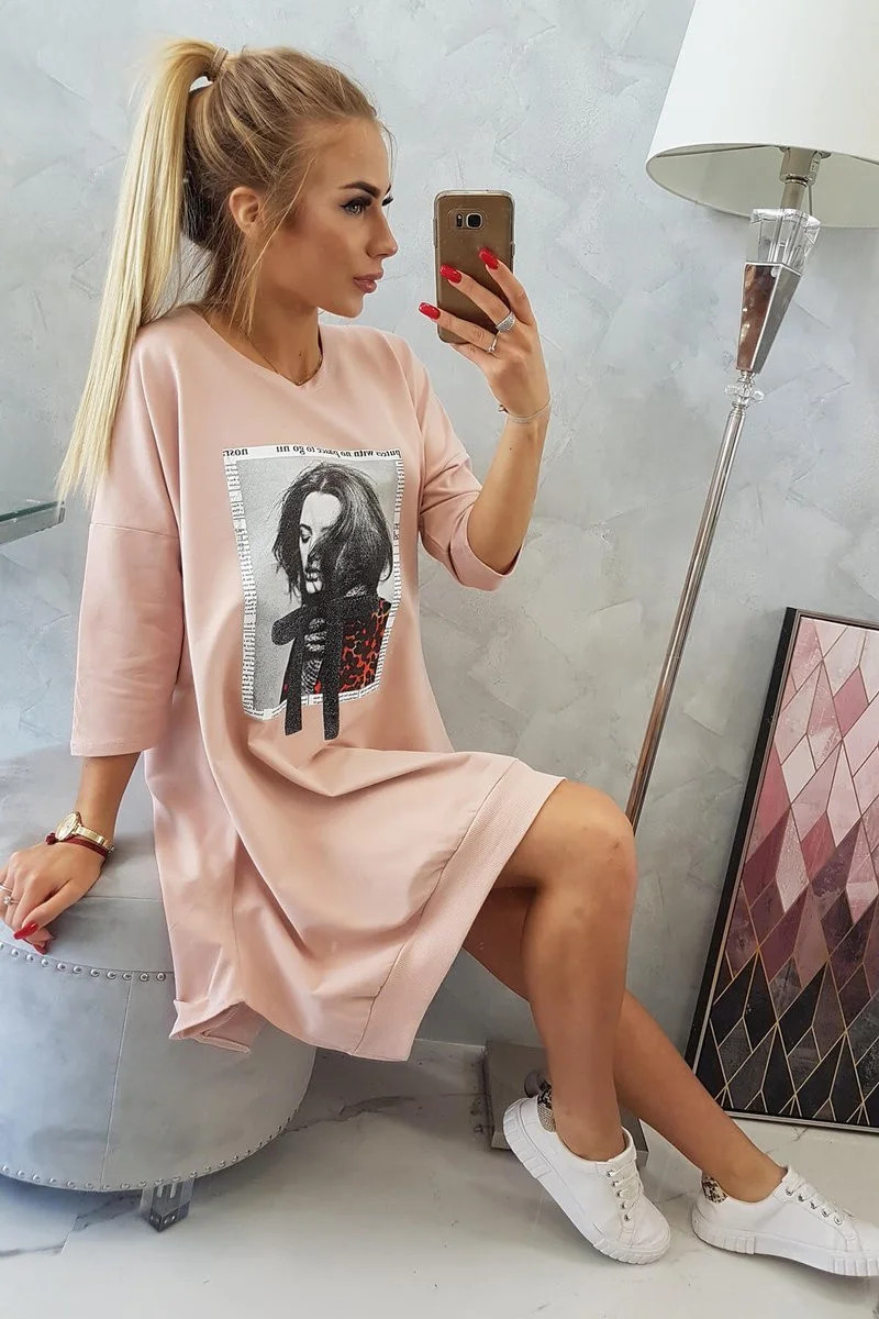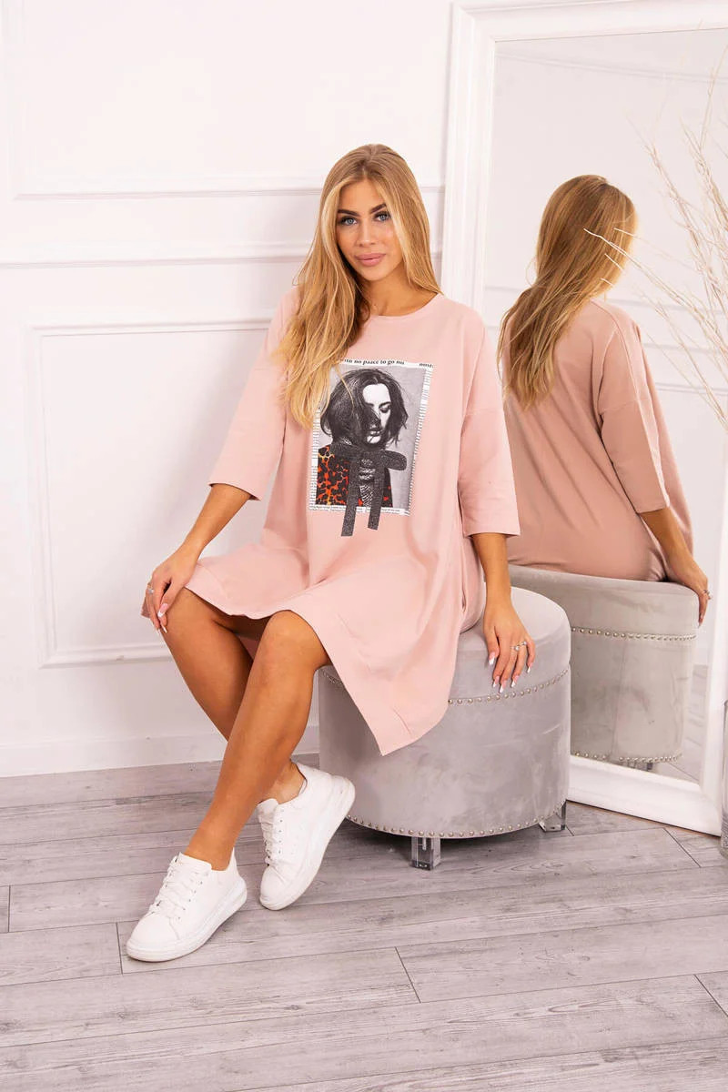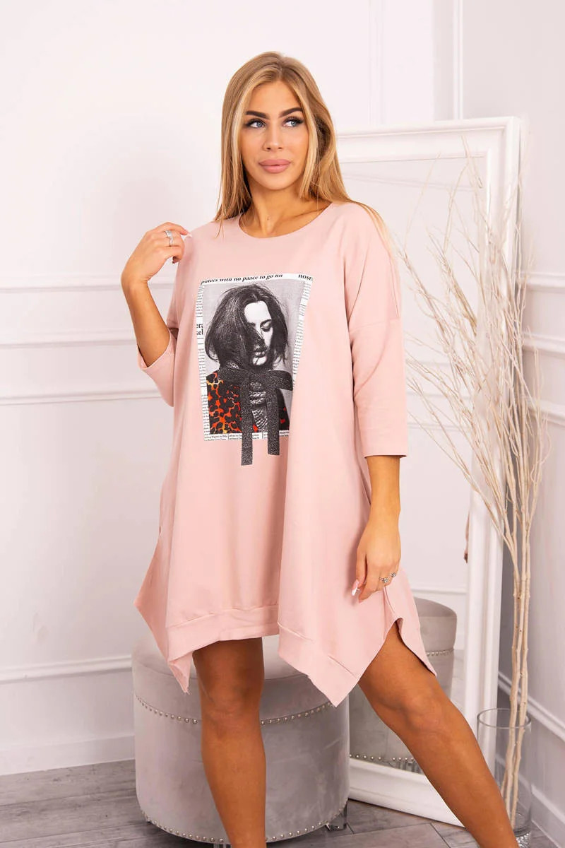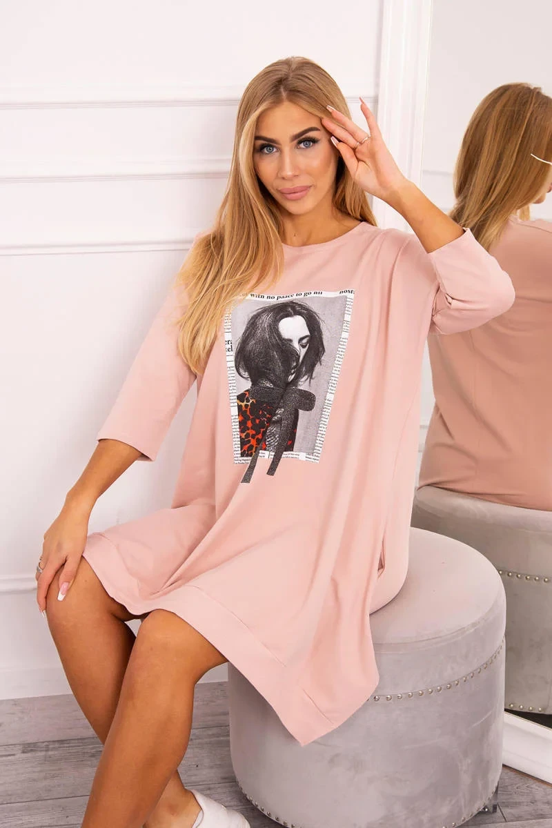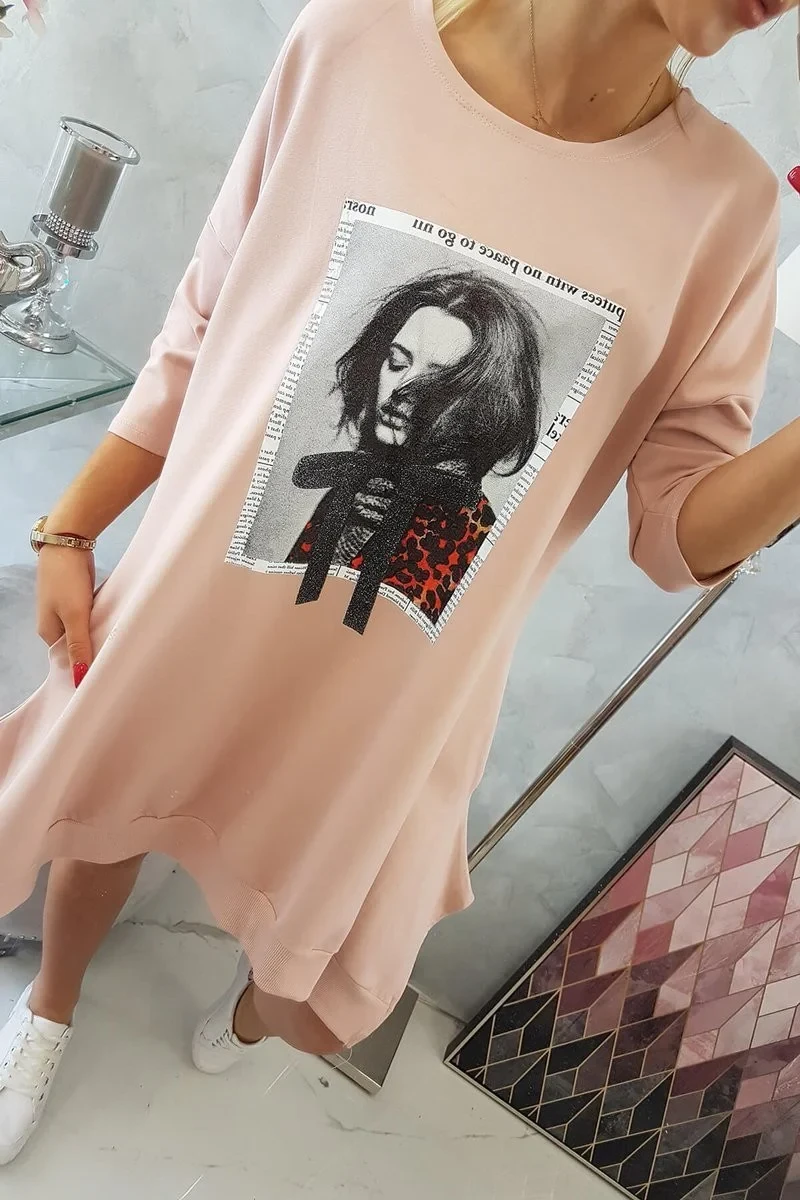 Šaty s potiskem a rozšířeným spodním dílem tmavě pudrově růžové
