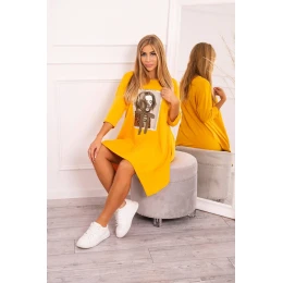 Šaty s potiskem a rozšířeným spodním dílem v hořčicové barvě