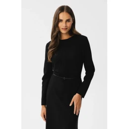 65% polyester 30% viskóza 5% elastan DETAILY PRODUKTU: šaty z tkané látky s ozdobnými svislými záševky v přední části dlouhé rukávy spona pásek z umělé kůže součástí balení délka pod kolena a šikmý střih sukně bez podšívky skrytý zip na zádech naše modelka měří 174 cm a nosí velikost S navrženo a vyrobeno v Polsku