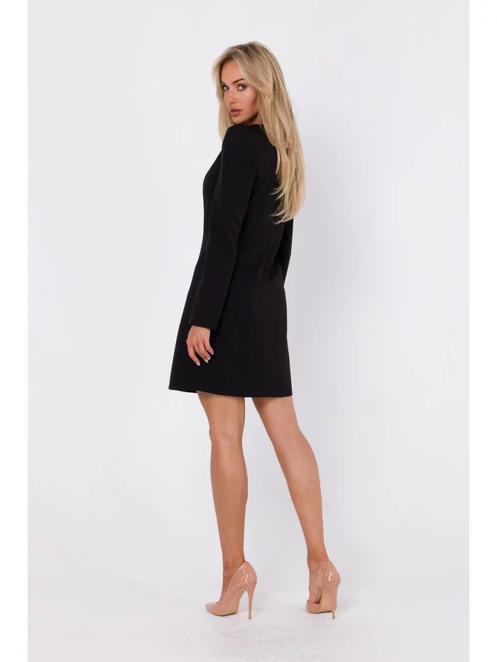 INFORMACE O PRODUKTU: tkaná látka pouzdrové šaty s modelujícím prošíváním mini délka dlouhé rukávy s vycpanými rameny krátké nohavice rozdělené skrytý zadní zip bez podšívky naše modelka je vysoká 171 cm a nosí velikost S Navrženo a vyrobeno v Polsku.