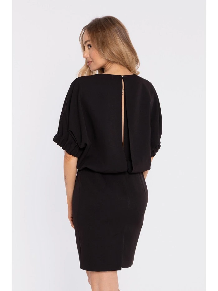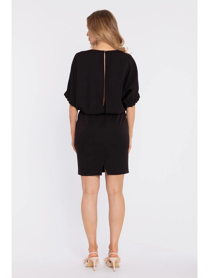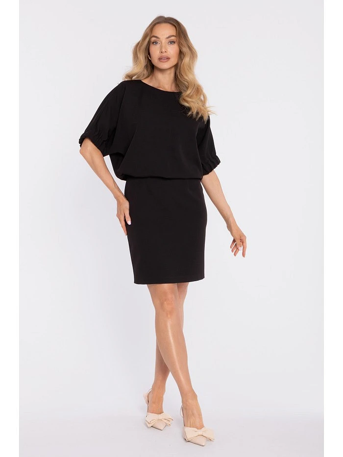 95% polyester 5% elastane MATERIAL Smooth woven fabric with a matte finish. PRODUCT DETAILS Neckline: front – round and modest; back – deeper vertical slit fastened with a single button. Sleeves: short, puff sleeves finished with elastic cuffs. Waist: subtly defined thanks to the blouson-style top. Skirt: straight, slightly fitted, with a short back slit. Closure: single button at the back neckline; concealed zip at the back. Pockets: none. Lining: none. Model: M904. Designed and made in Poland. The model in the photo is 171 cm tall and is wearing size S. FIT AND CUT Style: elegant, minimalist mini dress with a relaxed top and puff sleeves. Shape: oversized, blouson-like upper part; straight, lightly fitted skirt. Length: mini.