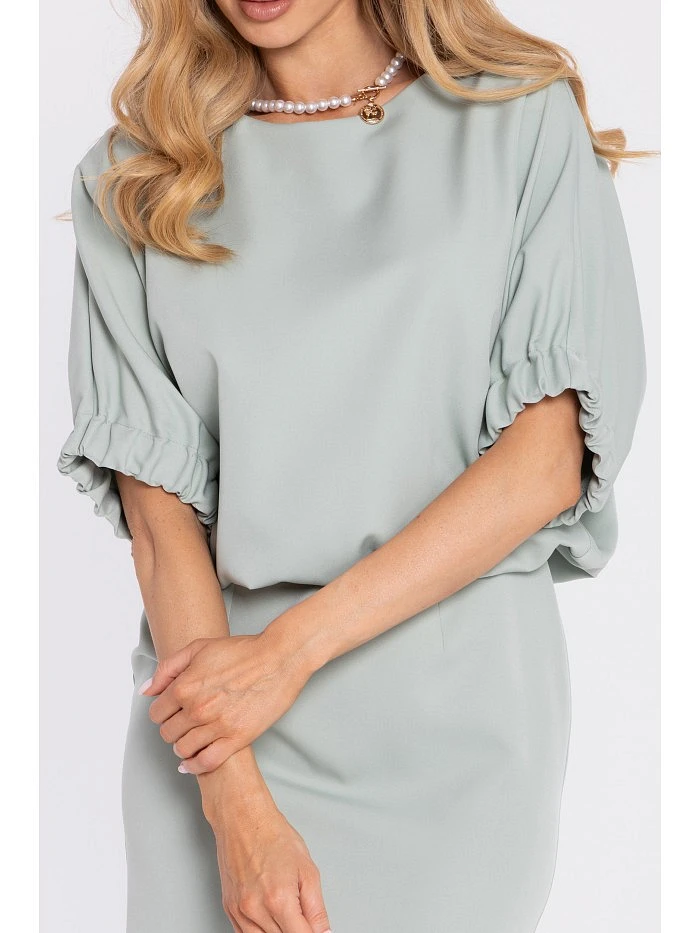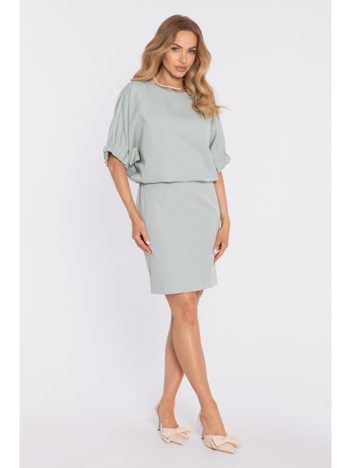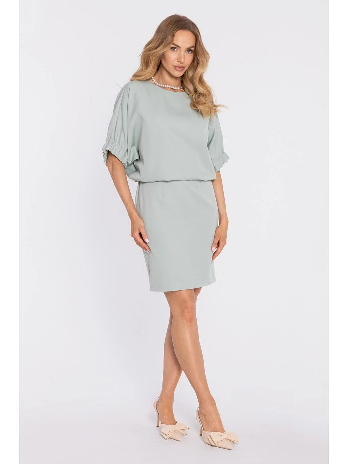 95% polyester 5% elastane MATERIAL Smooth woven fabric with a matte finish. PRODUCT DETAILS Neckline: front – round and modest; back – deeper vertical slit fastened with a single button. Sleeves: short, puff sleeves finished with elastic cuffs. Waist: subtly defined thanks to the blouson-style top. Skirt: straight, slightly fitted, with a short back slit. Closure: single button at the back neckline; concealed zip at the back. Pockets: none. Lining: none. Model: M904. Designed and made in Poland. The model in the photo is 171 cm tall and is wearing size S. FIT AND CUT Style: elegant, minimalist mini dress with a relaxed top and puff sleeves. Shape: oversized, blouson-like upper part; straight, lightly fitted skirt. Length: mini.