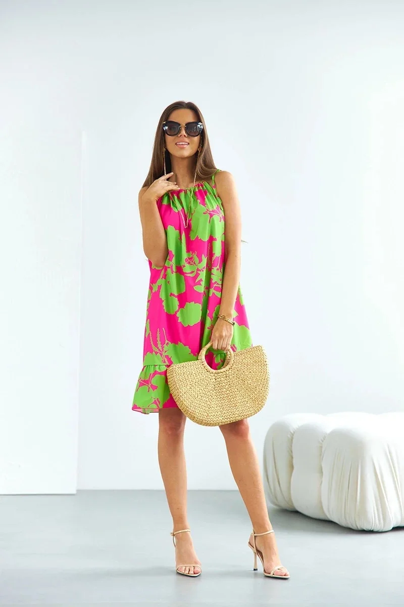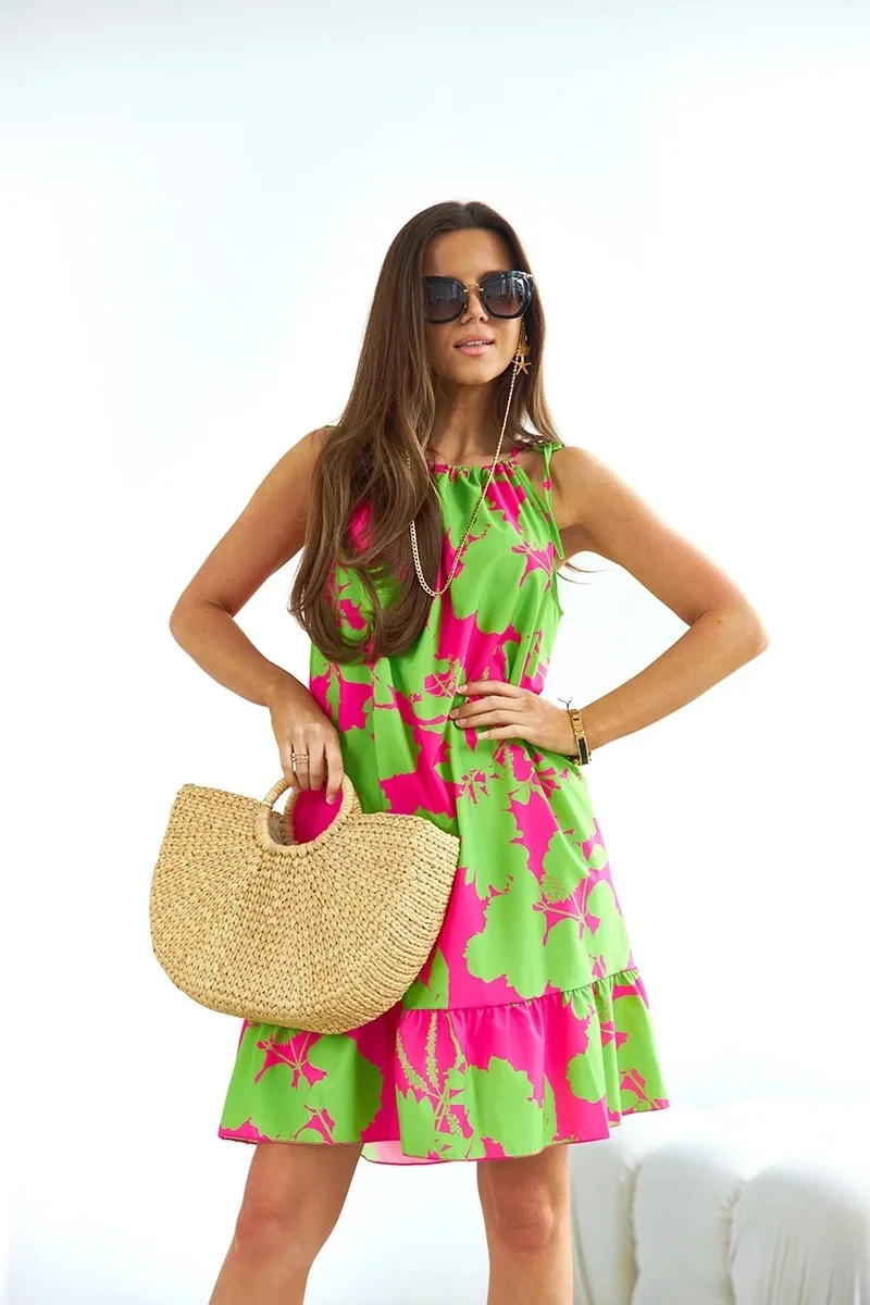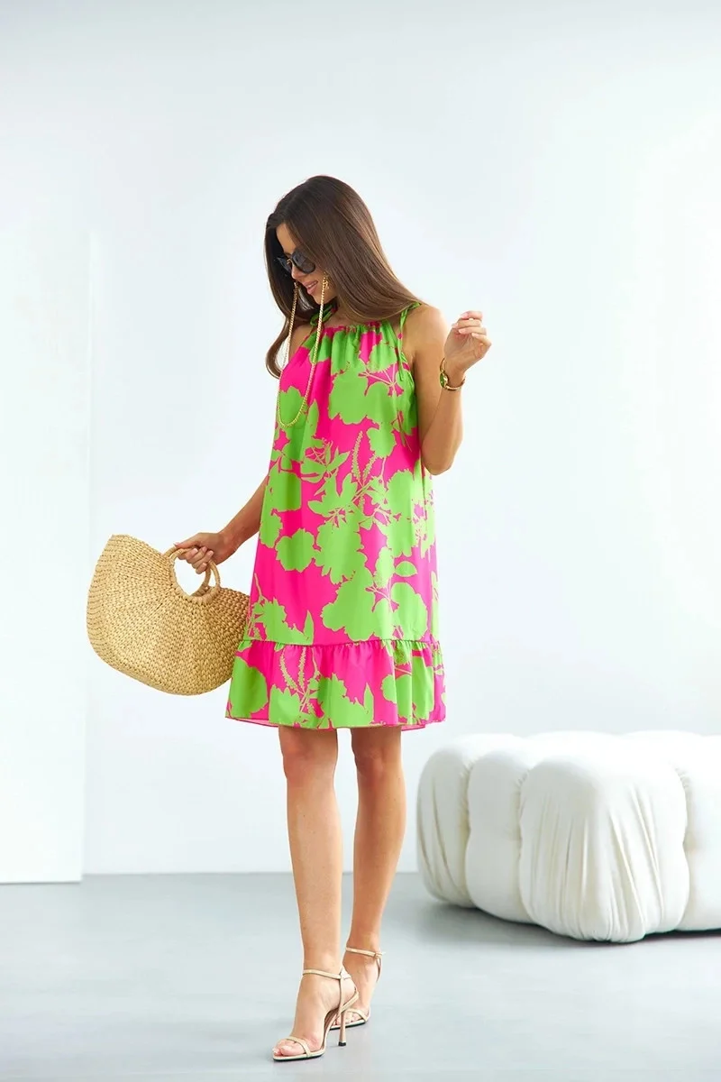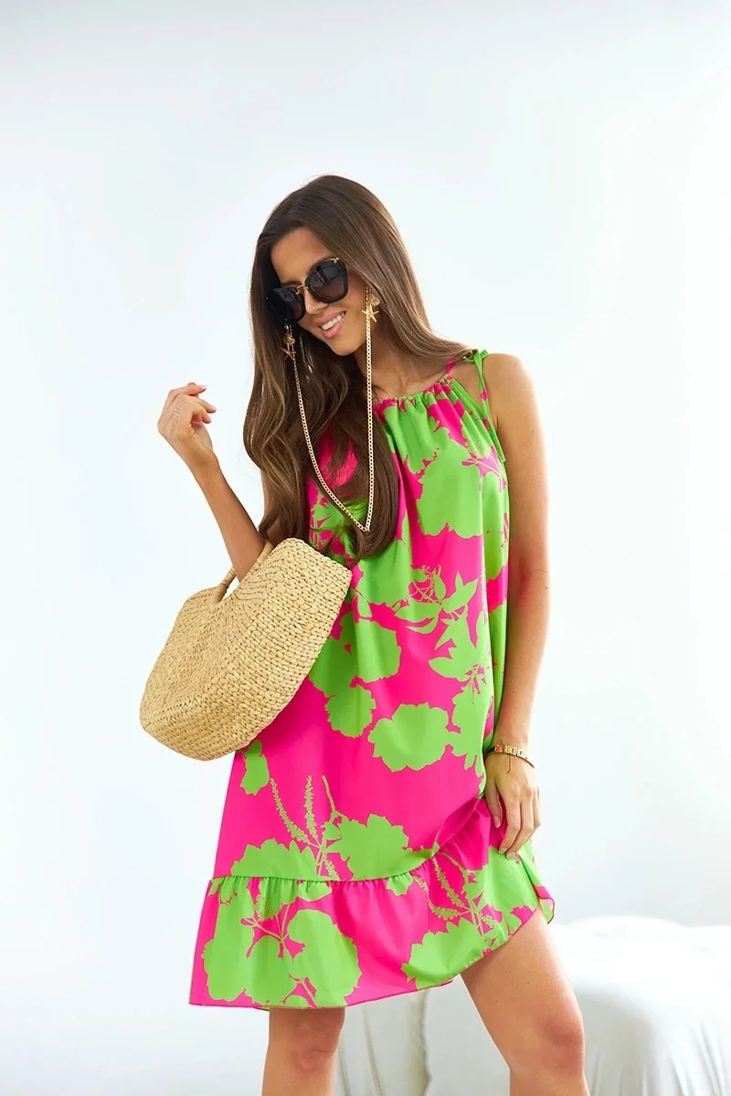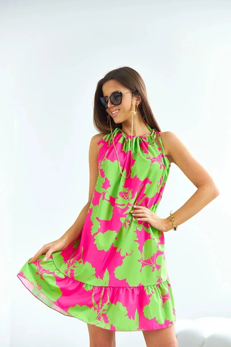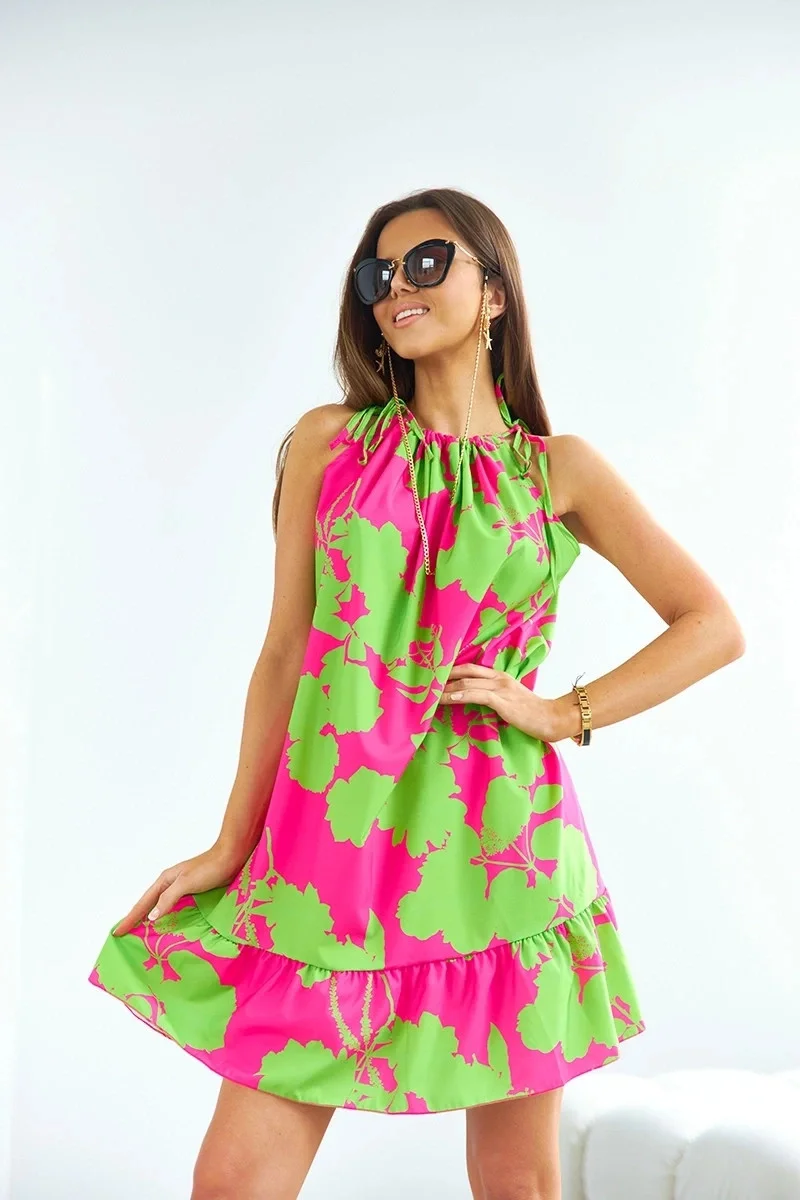 Šaty mají jednoduchý střih, délku mini a mají pásek pro zavazování. Model se zavazuje za krkem ramínky.