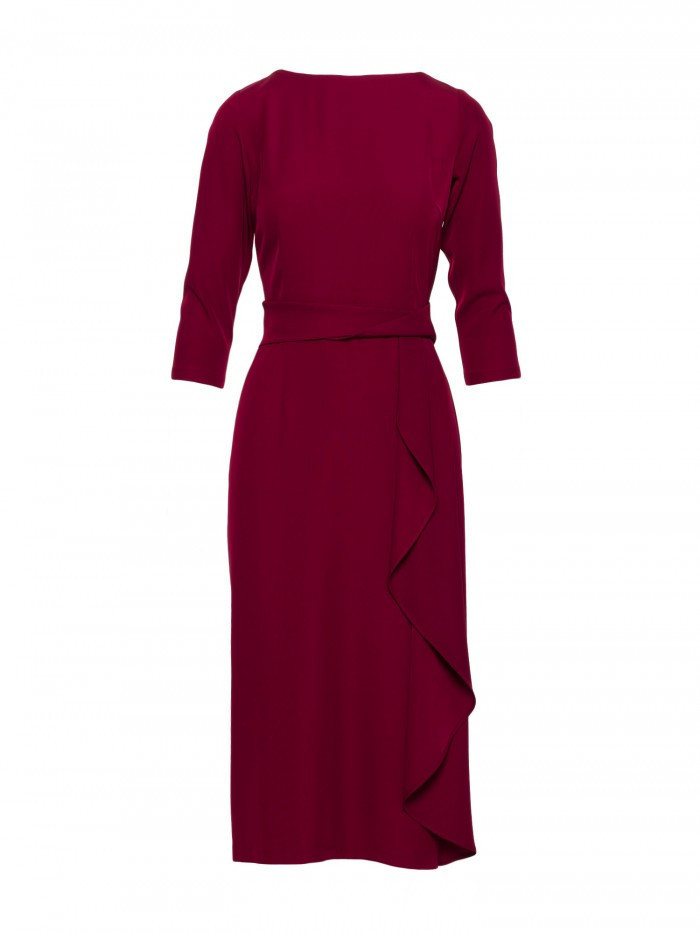 Výstřih: kulatý Rukávy: 3/4 délky Sukně: rovná, s ozdobným volánem podél boční linie sukně, vzadu vysoký rozparek