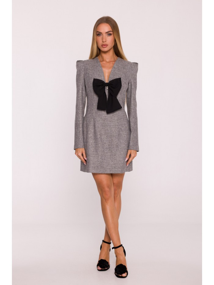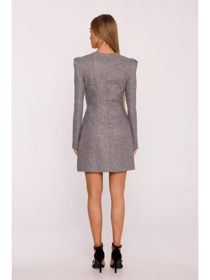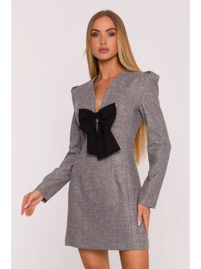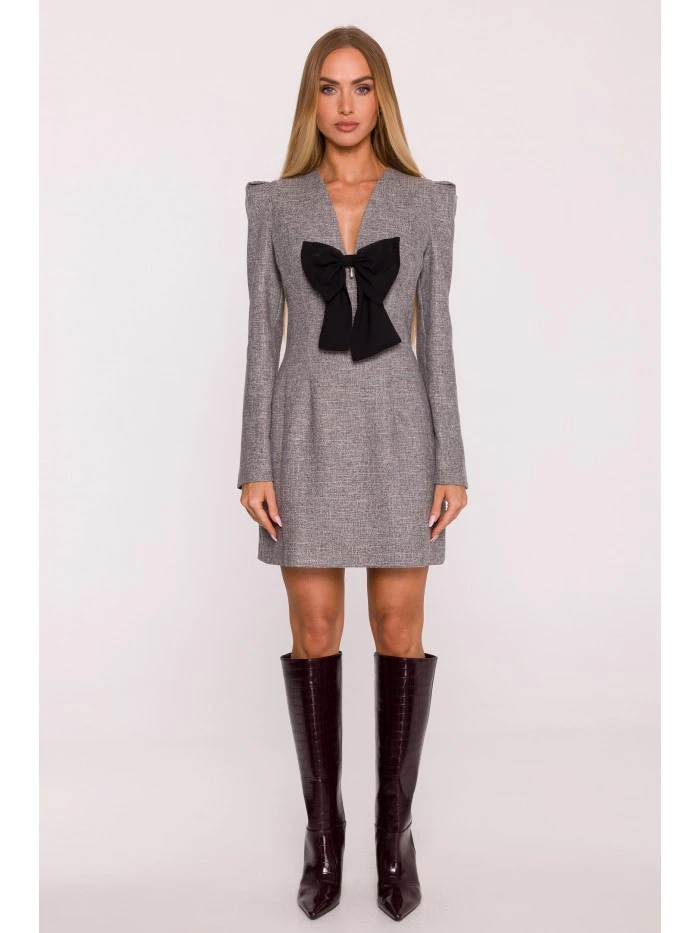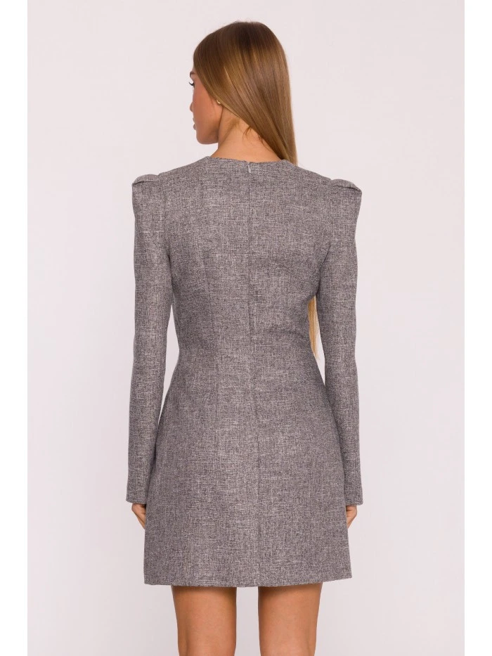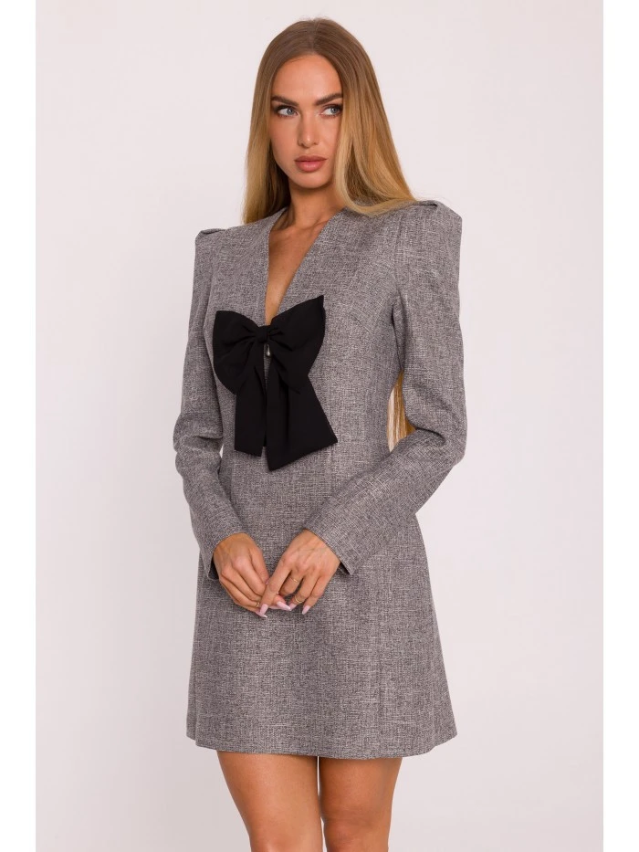 Hlavní tkanina: 70% polyester 27% rayon 3% spandex Podšívka: 95% polyester 5% elastan Materiál: Tkanina Tweed PODROBNOSTI O PRODUKTU Výstřih: Hluboký výstřih do V Rukávy: Dlouhé Zapínání: Skrytý zip na zádech Kapsy: Žádné Podšívka: Ano Vzor: Mélange Detaily: Ozdobný odnímatelný detail - šifonová mašle s přívěskem ve stylu šperku Model: M869 Navrženo a vyrobeno v Polsku Modelka na fotografii měří 171 cm a má na sobě velikost S Střih a střih Střih: Lehce přizpůsobený Tvar: Zvýrazňující pas, mírně rozšířená ramena s puff detaily Délka: Mini