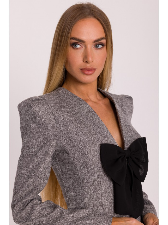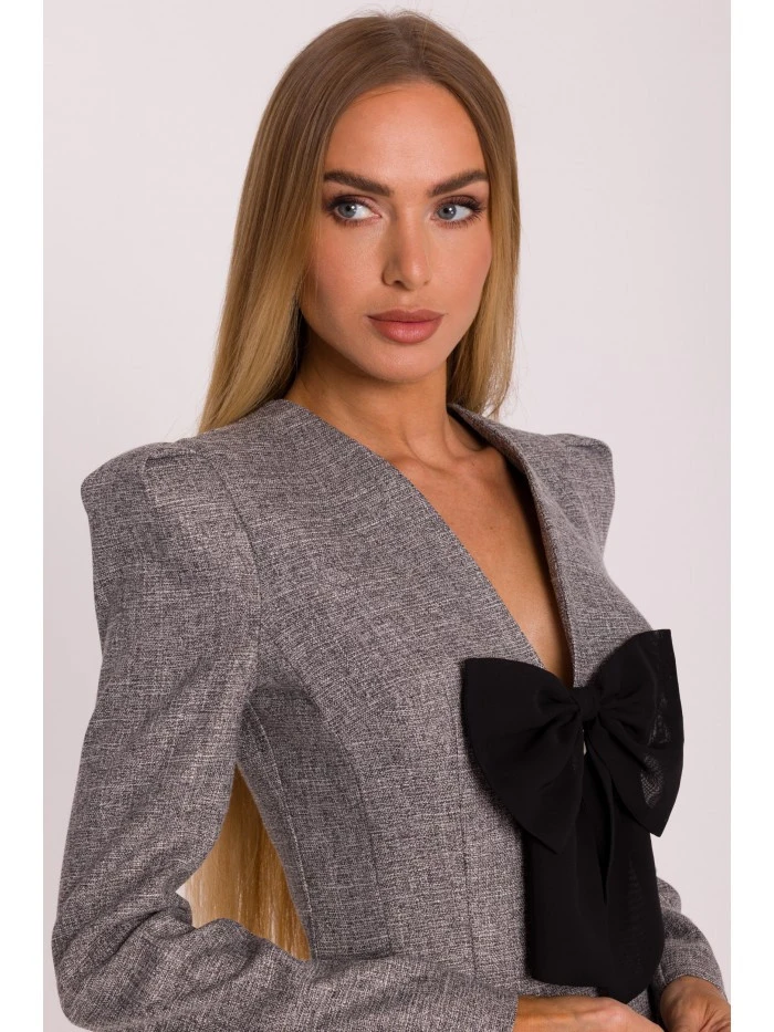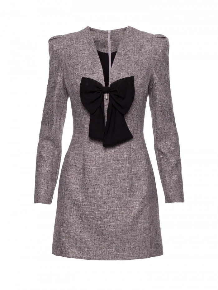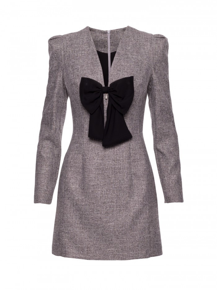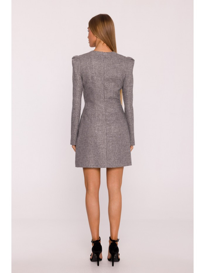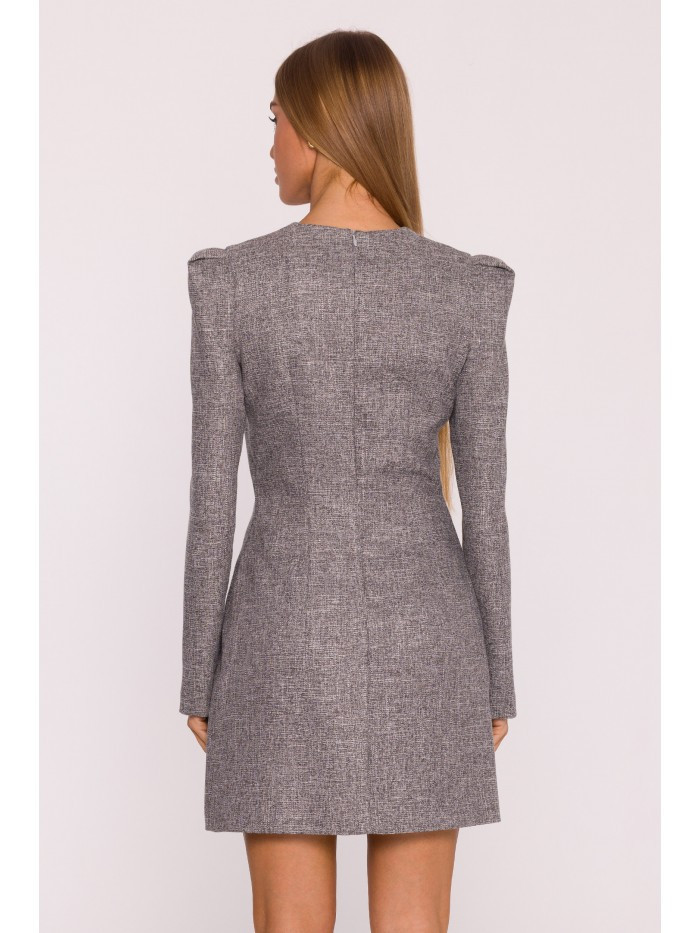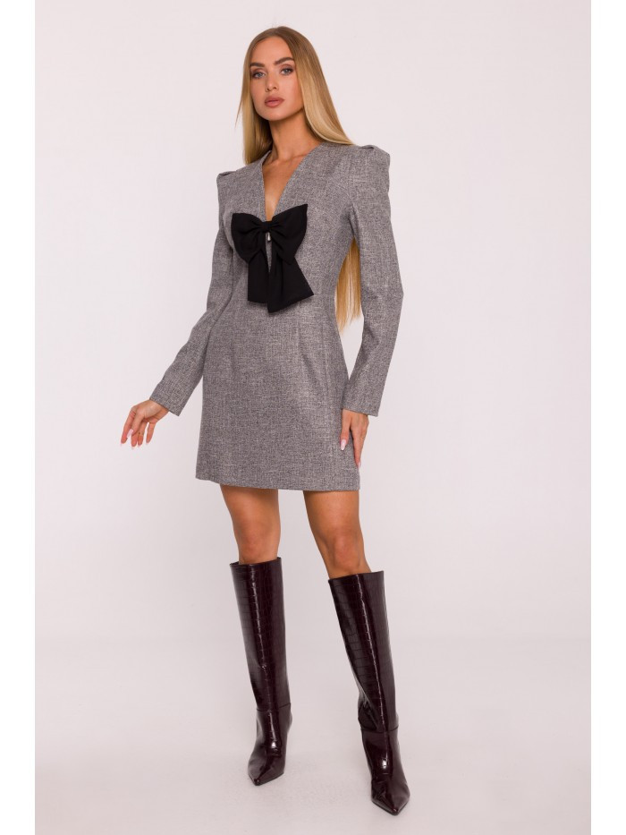 Hlavní tkanina: 70% polyester 27% rayon 3% spandex Podšívka: 95% polyester 5% elastan Materiál: Tkanina Tweed PODROBNOSTI O PRODUKTU Výstřih: Hluboký výstřih do V Rukávy: Dlouhé Zapínání: Skrytý zip na zádech Kapsy: Žádné Podšívka: Ano Vzor: Mélange Detaily: Ozdobný odnímatelný detail - šifonová mašle s přívěskem ve stylu šperku Model: M869 Navrženo a vyrobeno v Polsku Modelka na fotografii měří 171 cm a má na sobě velikost S Střih a střih Střih: Lehce přizpůsobený Tvar: Zvýrazňující pas, mírně rozšířená ramena s puff detaily Délka: Mini