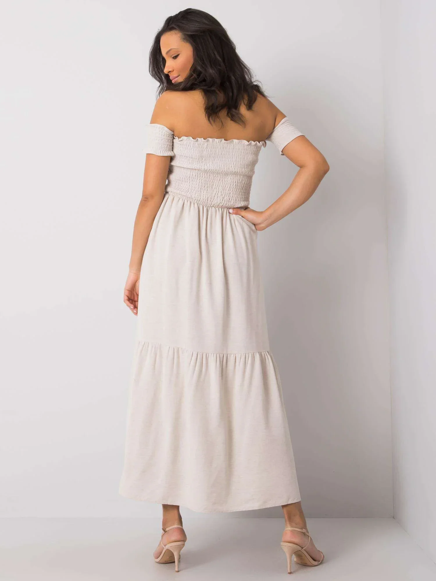 RUE PARIS Béžové dlouhé šaty s volánem.