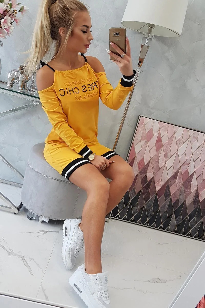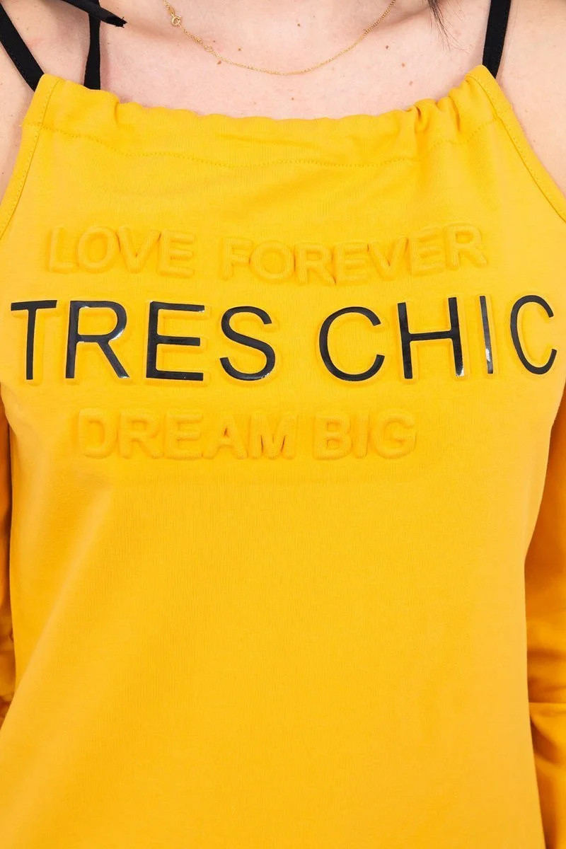 Prezentujemy Państwu wygodną sukienkę z napisem Tres Chic. Sukienka wykonana jest z wysokiej jakości materiału. Rozmiar jest uniwersalny i będzie odpowiedni dla Pań noszących rozmiar S, M lub L.